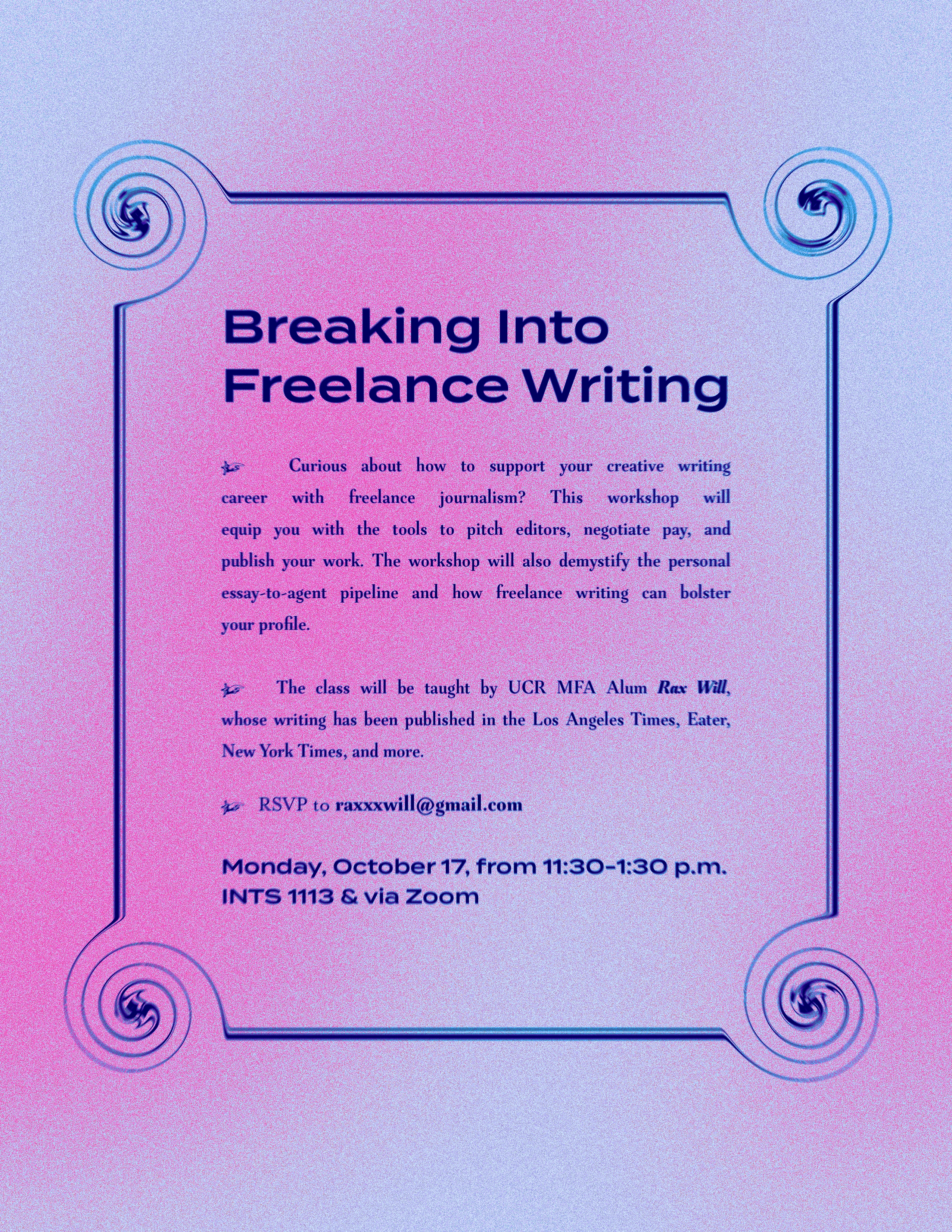 The class will be taught by UCR MFA Alum Rax Will, whose writing has been