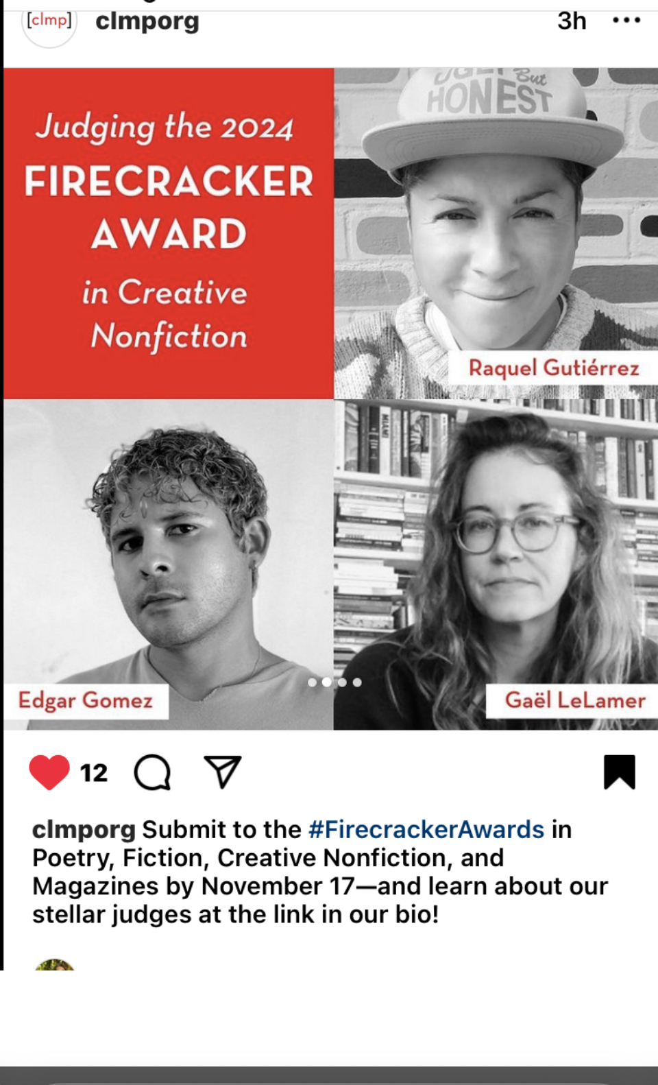 [Crwt-undergrad-info] UCR CWPA alum Edgar Gomez is jurying the 2024 CLMP Firecracker awards in CNF!