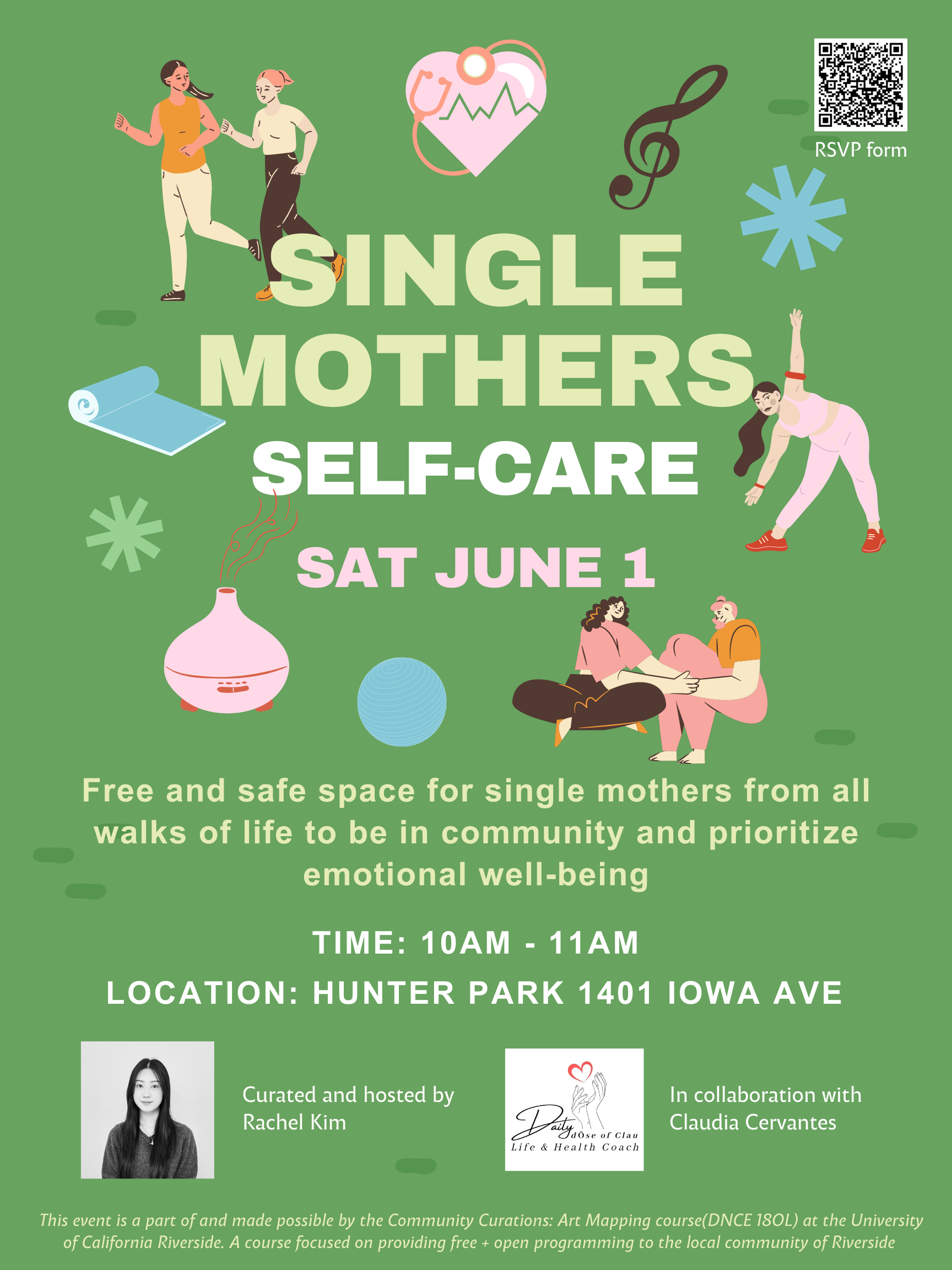 My name is Rachel Kim, and I am a fourth-year Dance Major. I am reaching out to seek your support for an event I am hosting as part of the Community Curations: Art Mapping course (DNCE 180L). The event aims to support the emotional well-being of single mothers in the Riverside community. It is a free and open program for local single mothers, offering them a chance to connect with others, participate in essential oil therapy, share their experiences, heal, and enjoy a relaxing day.