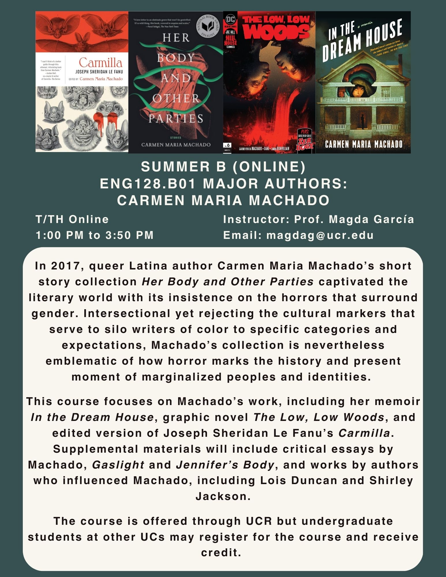 Seats still available for this ONLINE summer session B major authors course on queer horror writer Carmen Maria Machado: