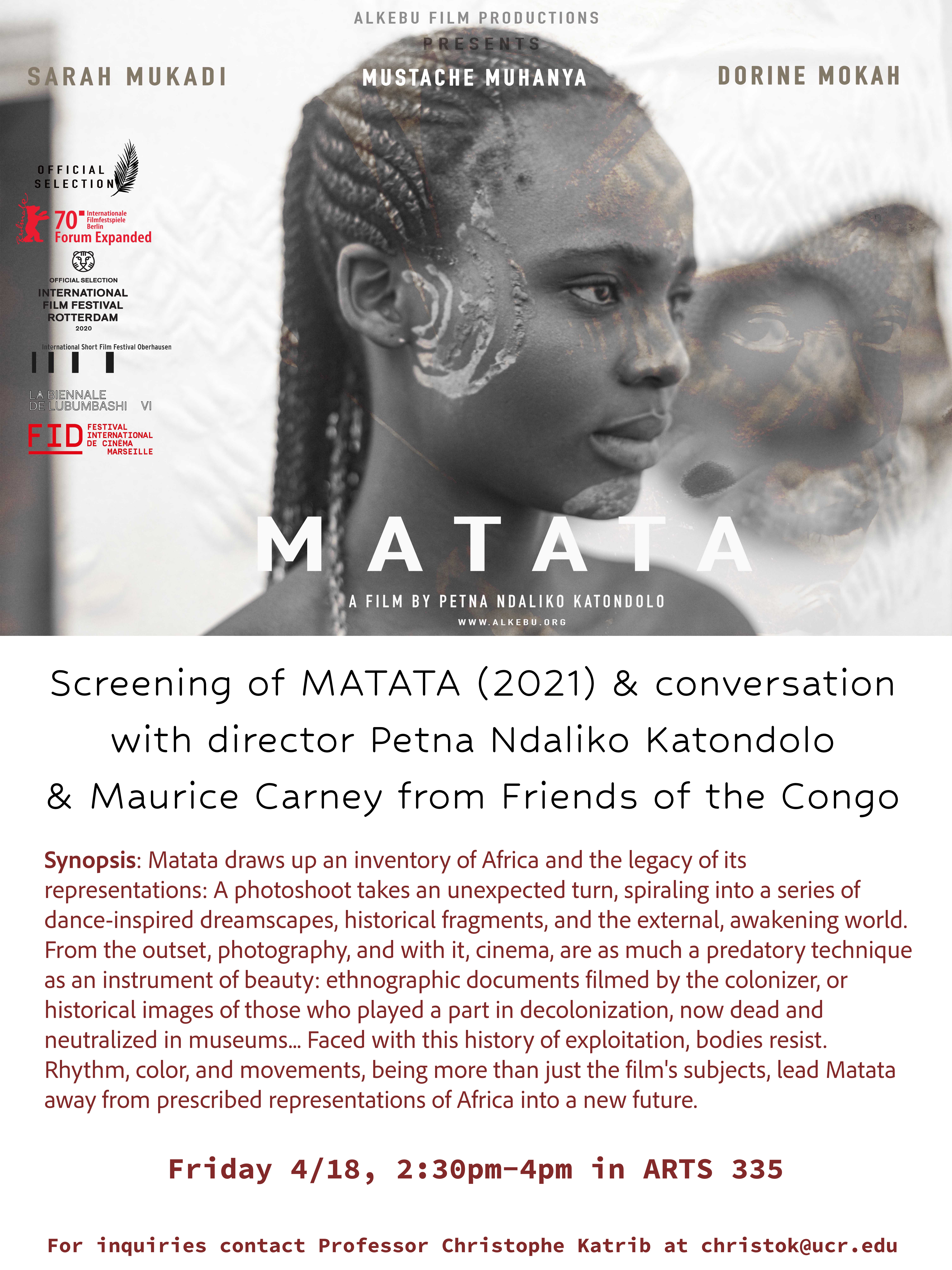> Today at 230 pm in Arts 335: Screening of MATATA and discussion hosted by film professor Christophe Katrib with filmmaker Petna Ndaliko Katondolo and Friends of Congo.