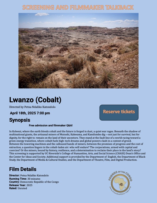 >> I wanted to alert folks to a screening and talkback that I have organized, in partnership with the William Grant Still Arts Center (Los Angeles), of the short film Lwanzo (Cobalt) (2025) to be held at UCR ARTS this Friday, April 18th at 7pm. Admission is free. UCR professor of Political Science Kim Yi Dionne will be in conversation with the director, Petna Ndaliko Katondolo, following the screening.