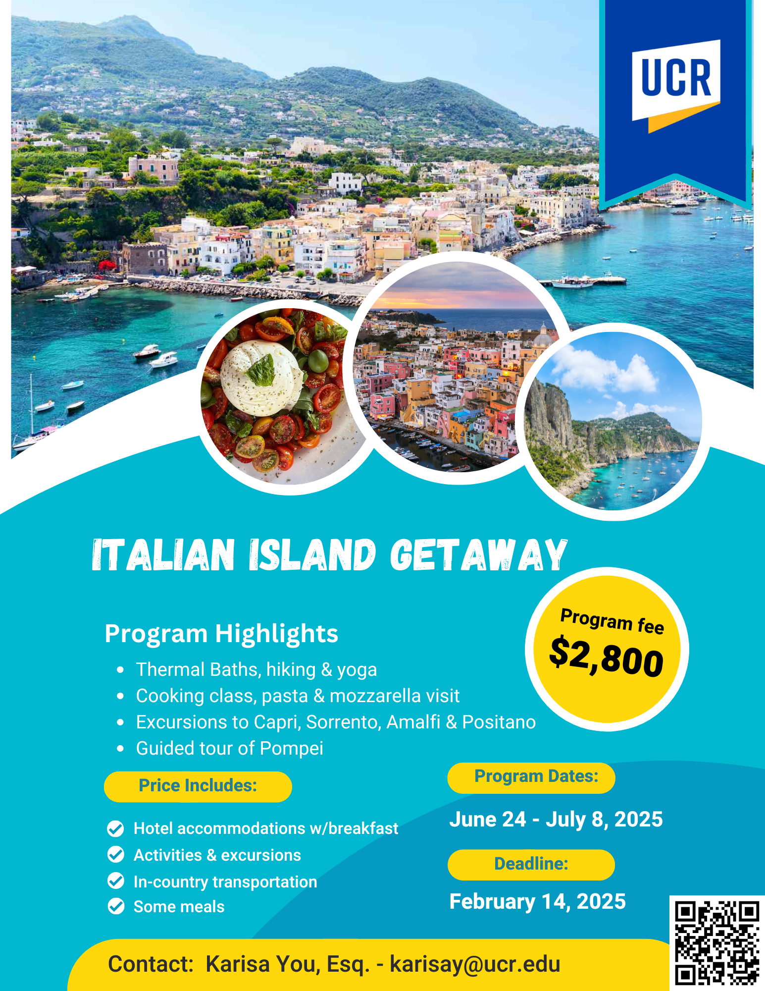 > I’m leading a UCR international trip to Ischia, Italy for undergraduate and graduate students this quarter. The program is two weeks, cost-effective, and an opportunity for students to explore Ischia and the Amalfi Coast with pasta-making classes, experiential learning, castle tours, thermal hot baths, etc.