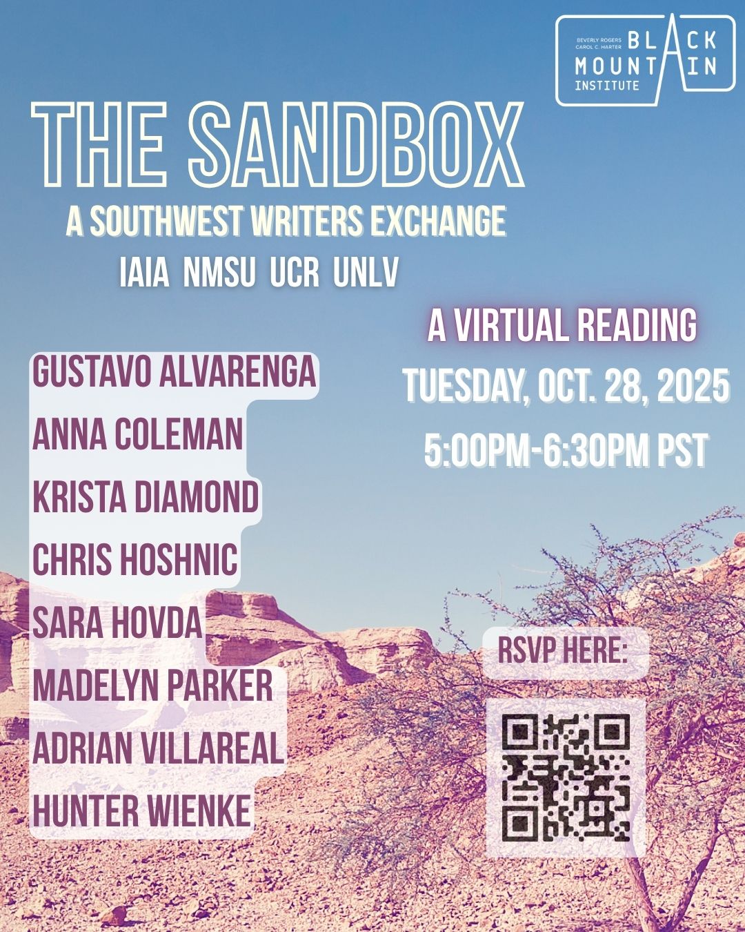 > Join Black Mountain Institute for a reading exchange between four Creative Writing Programs situated in the Southwest: The Institute of American Indian Arts (IAIA), New Mexico State (NMSU), the University of California, Riverside (UC Riverside), and the University of Nevada, Las Vegas (UNLV). The Sandbox Exchange will feature two readers from each university. Please join us as we bring writers in conversation with one another for this virtual event. It is our hope to share what it looks like to be writing from our landscapes today and showcase our vibrant Southwest literary community.