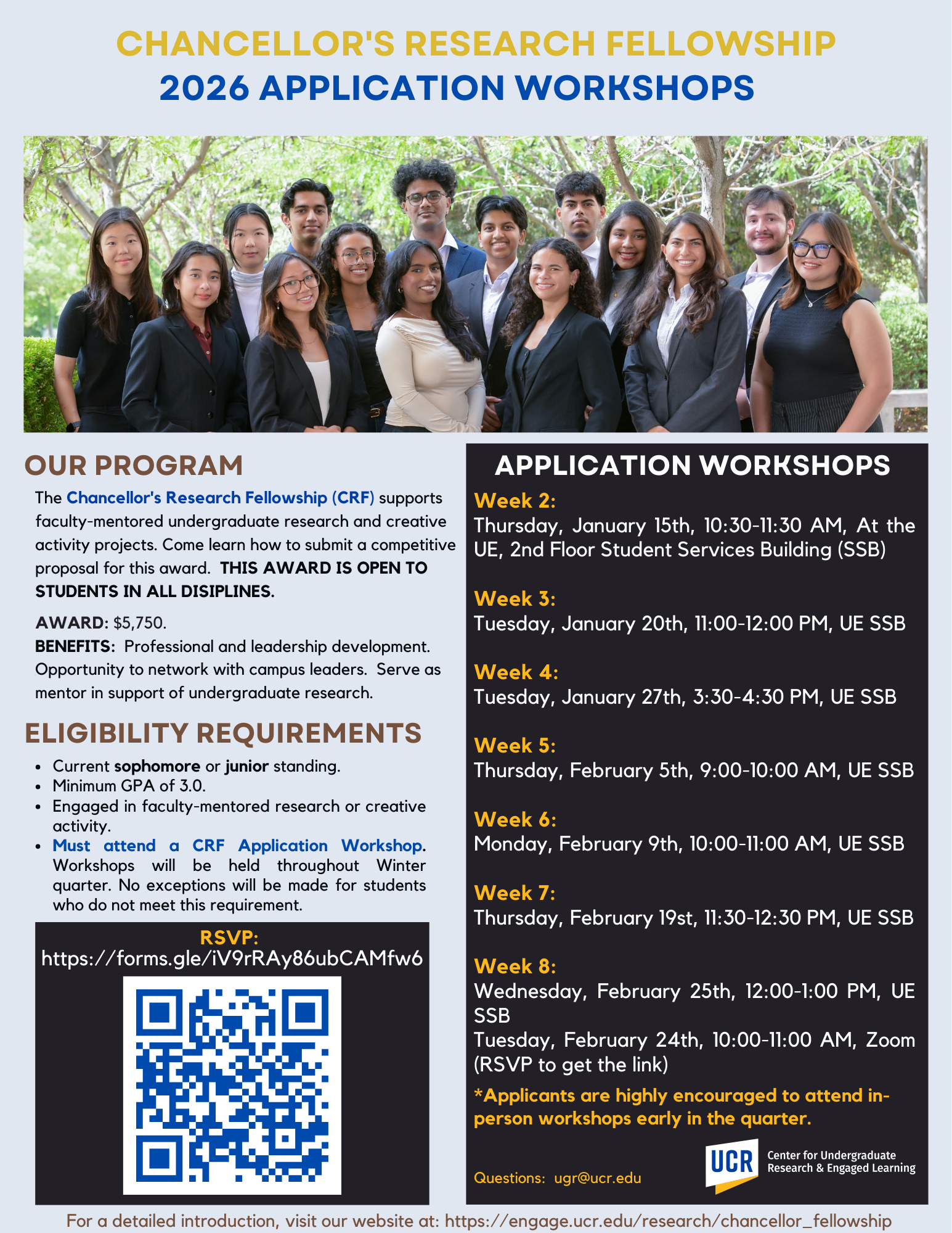 > Please encourage promising sophomore & junior undergraduate researchers to apply for the Chancellor's Research Fellowship (CRF). Application workshops are being hosted weeks 2-8. Students can learn more by visiting the CRF Website <https://engage.ucr.edu/research/chancellor_fellowship>.