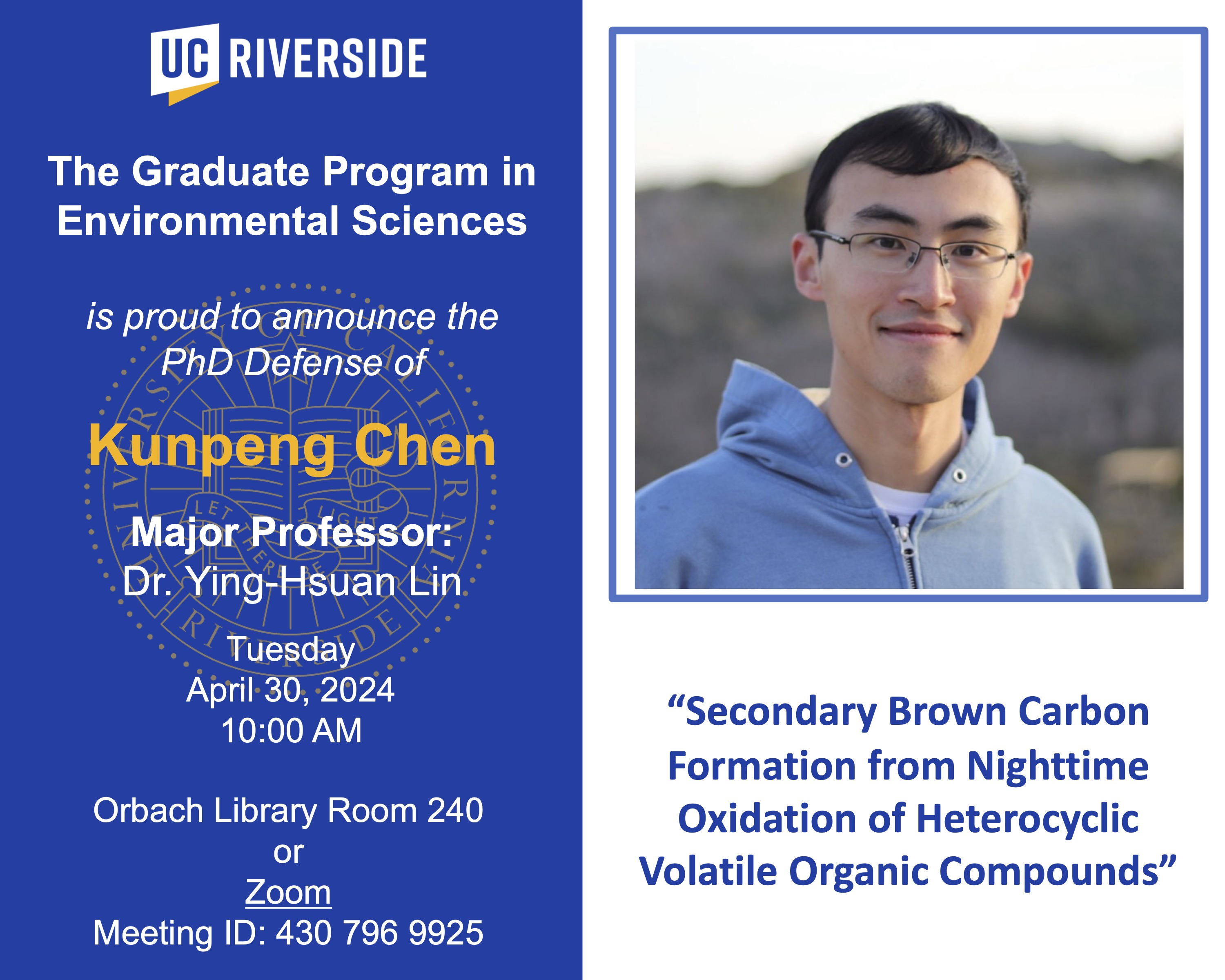 The Graduate Program in Environmental Sciences is proud to announce the PhD Dissertation Defense of Kunpeng Chen.