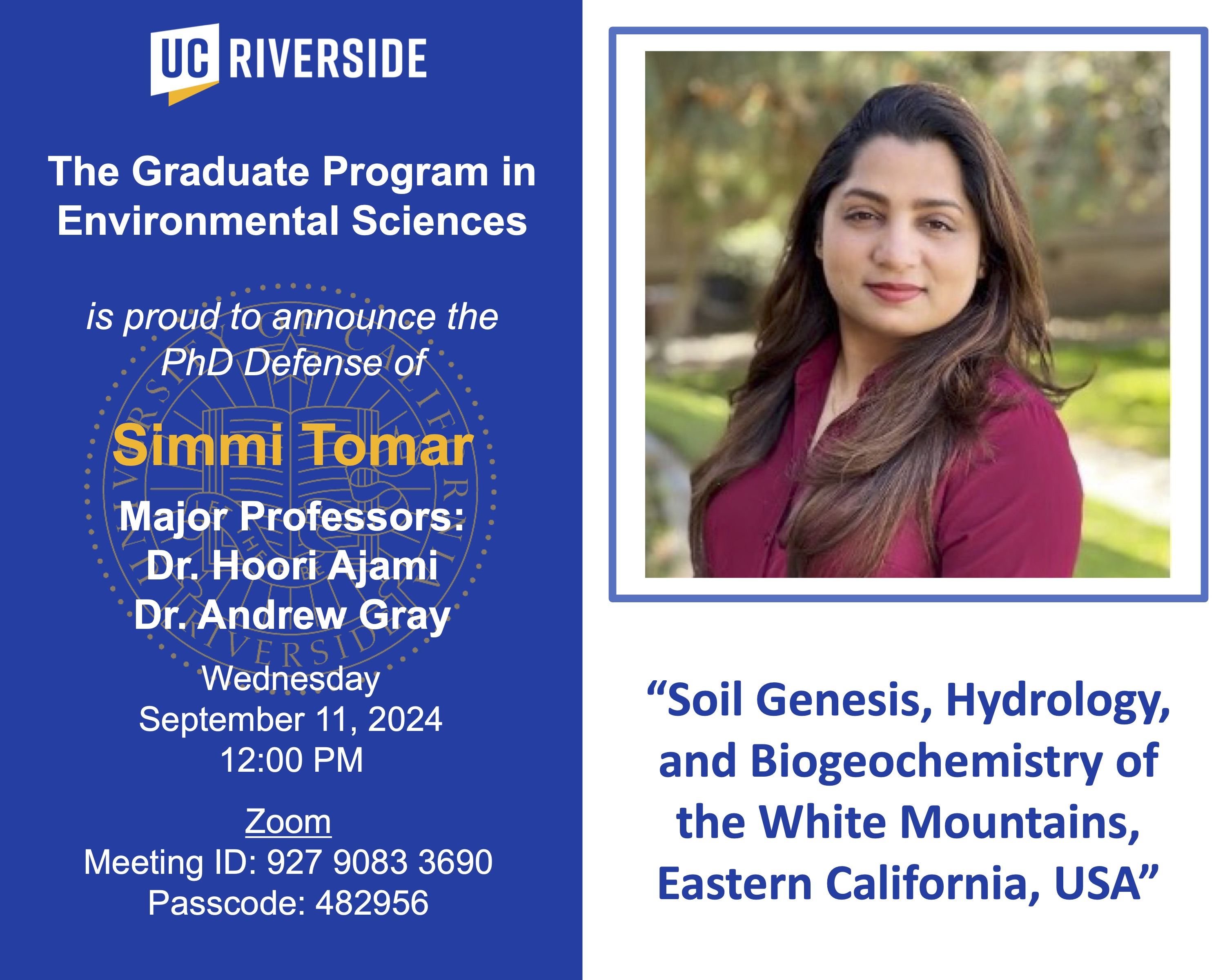 The Graduate Program in Environmental Sciences is proud to announce the PhD Dissertation Defense of Simmi Tomar.