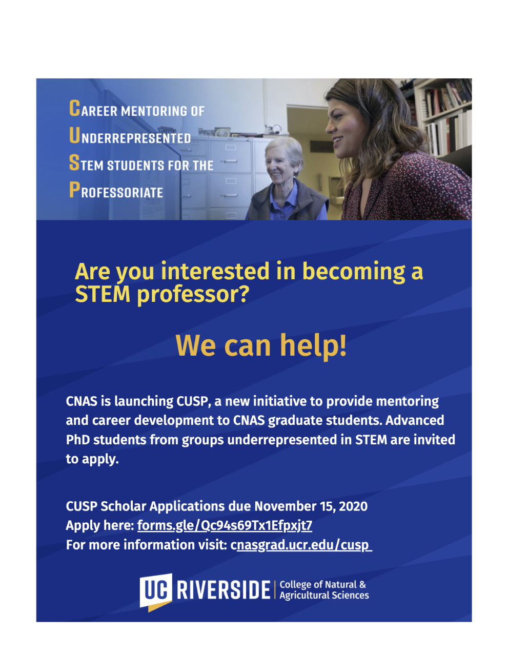 We are offering a summer stipend of $4000 for those students who participate in CUSP<https://cnasgrad.ucr.edu/cusp>: Career Mentoring of Underrepresented STEM Students for the Professoriate. The CUSP Scholar application<https://docs.google.com/forms/d/e/1FAIpQLSeFSbfKB-v5Al0FVz87Ze2u1LtOWUmx1Uy9PH9fpgzyPSj8Bg/viewform> is open until November 15, 2020. This project will recruit three CNAS doctoral candidates in 2020 to participate in the following: