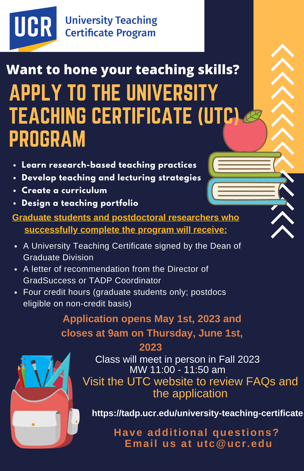 Please consider circulating this email and the attached flyer to your students. Applications for the Fall 2023 cohort of the University Teaching Certificate Program are due by 9:00 AM on June 1. Students must complete the application form<https://form.jotform.com/231006895345053> AND ask for a letter of reference to be submitted to utc at ucr.edu<mailto:utc at ucr.edu> directly.