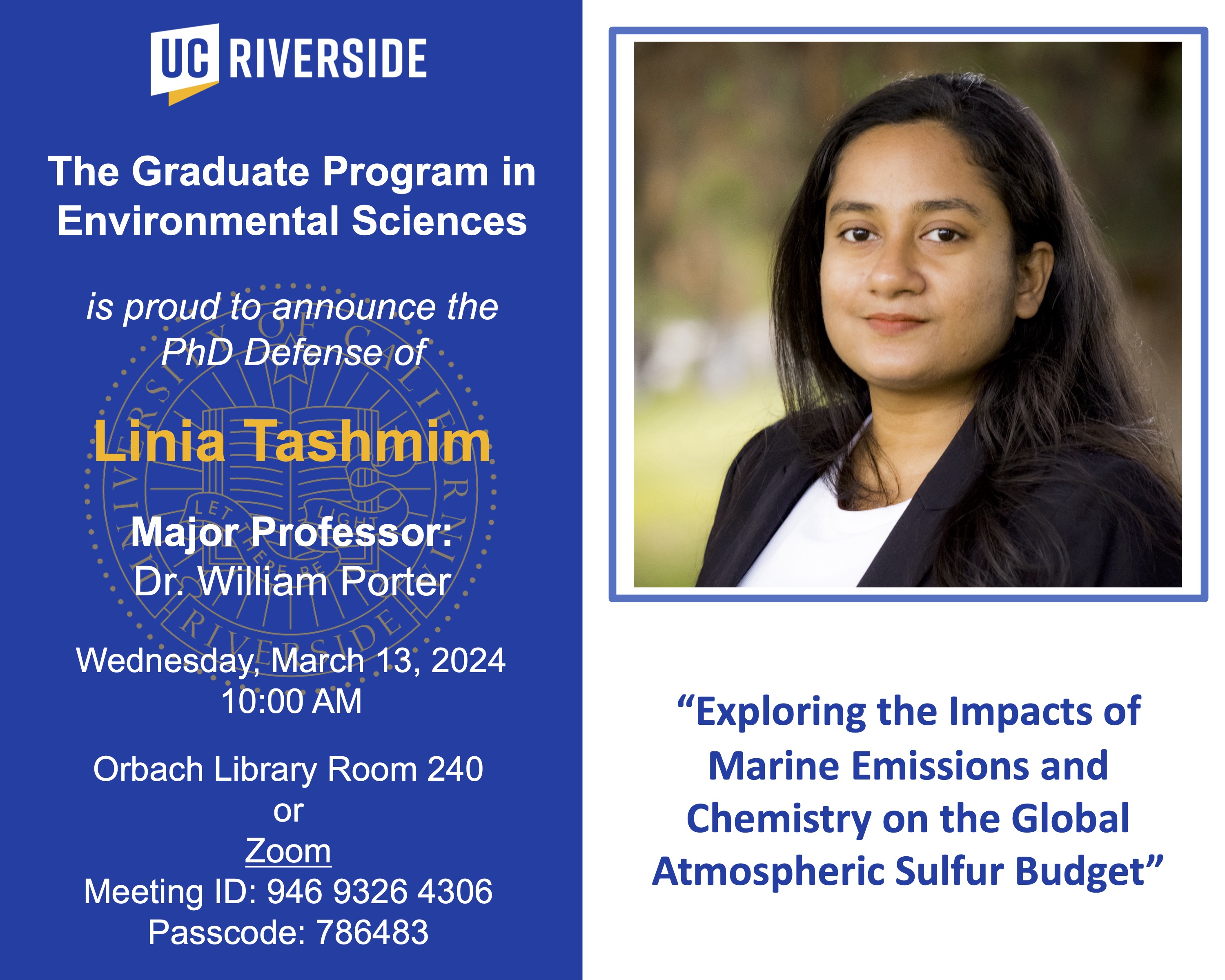 The Graduate Program in Environmental Sciences is proud to announce the PhD Dissertation Defense of Linia Tashmim.
