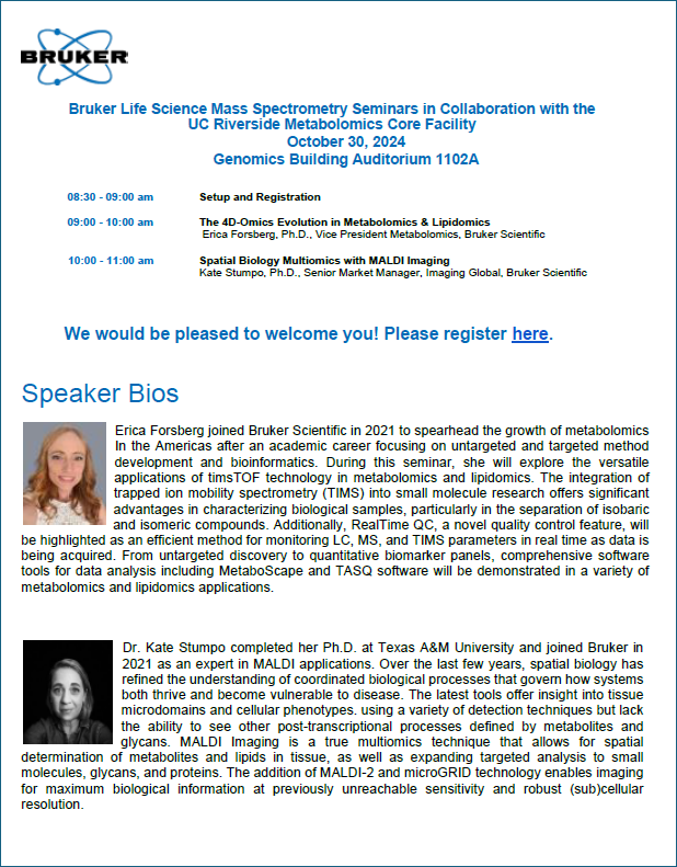 Check out the flyers for more details and secure your spot today [CLICK HERE<https://info.biospin-calid.bruker.com/UC-Riverside-Metabolomics-and-MALDI-Imaging-Seminars.html>].