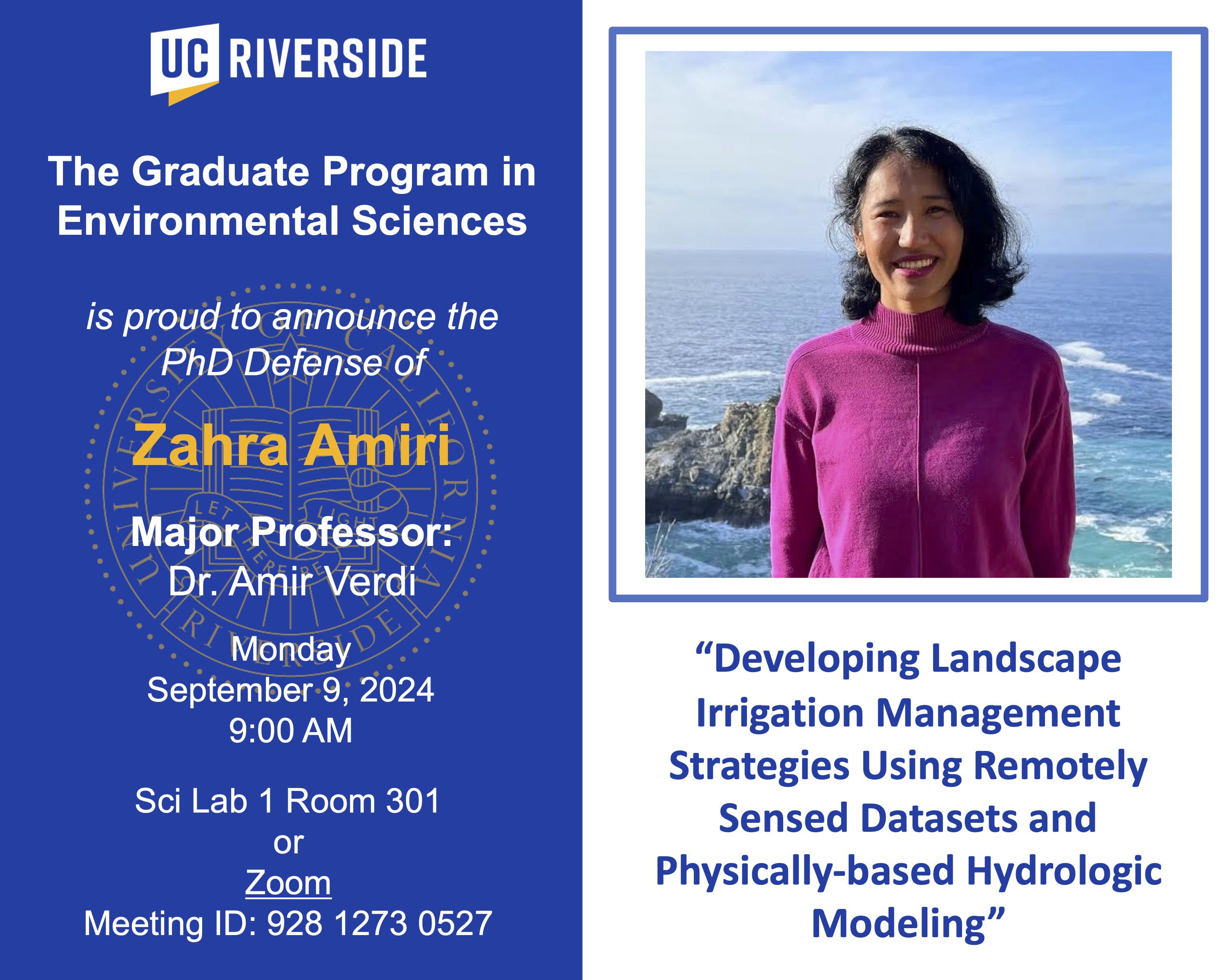 The Graduate Program in Environmental Sciences is proud to announce the PhD Dissertation Defense of Zahra Amiri.