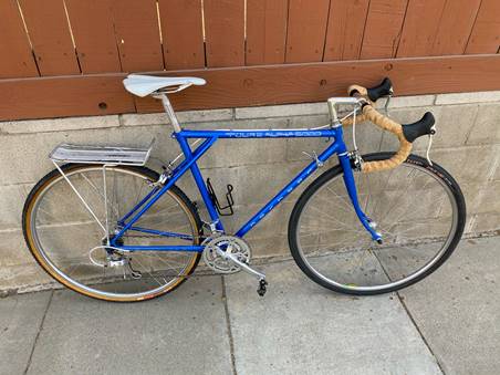 Unique vintage steel touring bike set up with a rear rack for panniers, new brake hoods, bar tape, cables, cable housing, new women's specific saddle, and cyclocross tires for dirt/gravel capabilities. I've used for commuting, grocery shopping, and several backroads bike camping trips, most recently on Catalina Island. It's a pretty versatile and reliable workhorse. Does not include pedals.