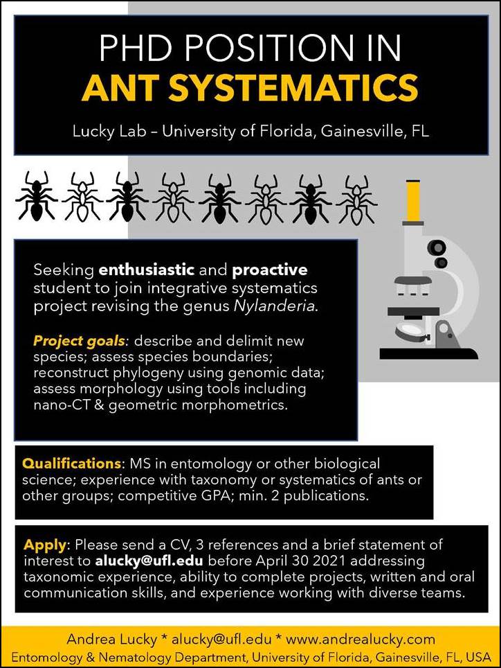 > This fully supported 4-year PhD position in my lab at the University of Florida is funded by a National Science Foundation grant through the ARTS program (Advancing Revisionary Systematics and Taxonomy). The project focuses on Nylanderia taxonomy and will involve dozens of new species descriptions. The student will be working primarily with museum collections as there are many many drawers of unsorted and un-identified Nylanderia in major collections. The project encompasses both molecular systematics (UCEs) and morphology (including CT-scanning and geometric morphometrics). Prior experience with these techniques is not necessary, but there will be lots of training opportunities to learn new tools, teach about ants, work with our local museum, and more. In addition to this position, my co-PI, John LaPolla, is also looking for a MS student to join his lab at Towson University.