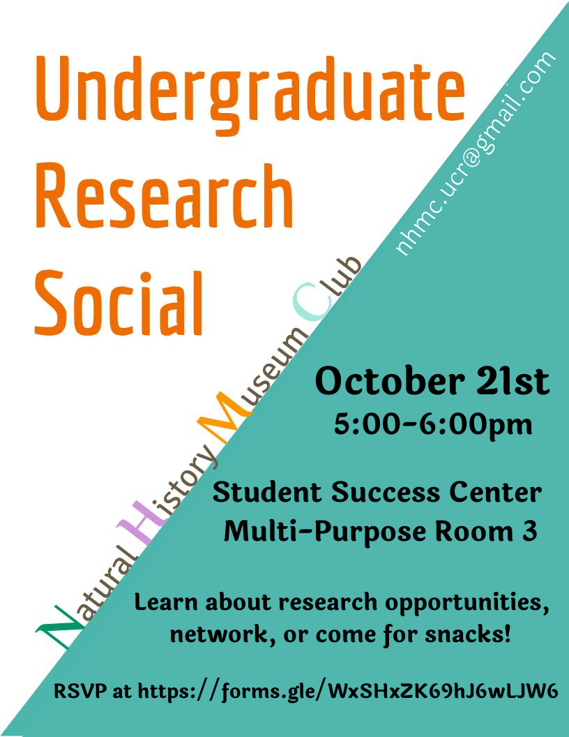 Join the Natural History Museum Club for our annual Undergraduate Research Social this Thursday! Come network with faculty, staff, and graduate students in a casual setting to learn about specimen-based research on campus and potential opportunities.