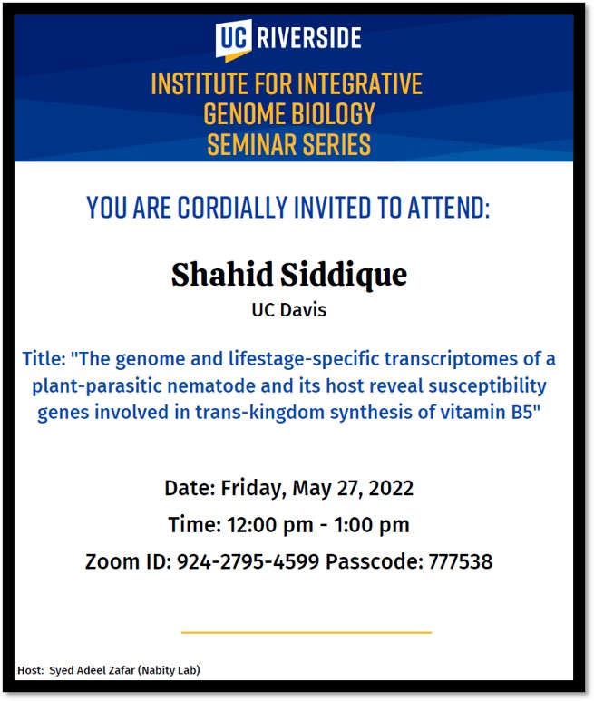 [Entm-beu] IIGB Virtual Seminar: Shahid Siddique - Friday, May 27, 2022