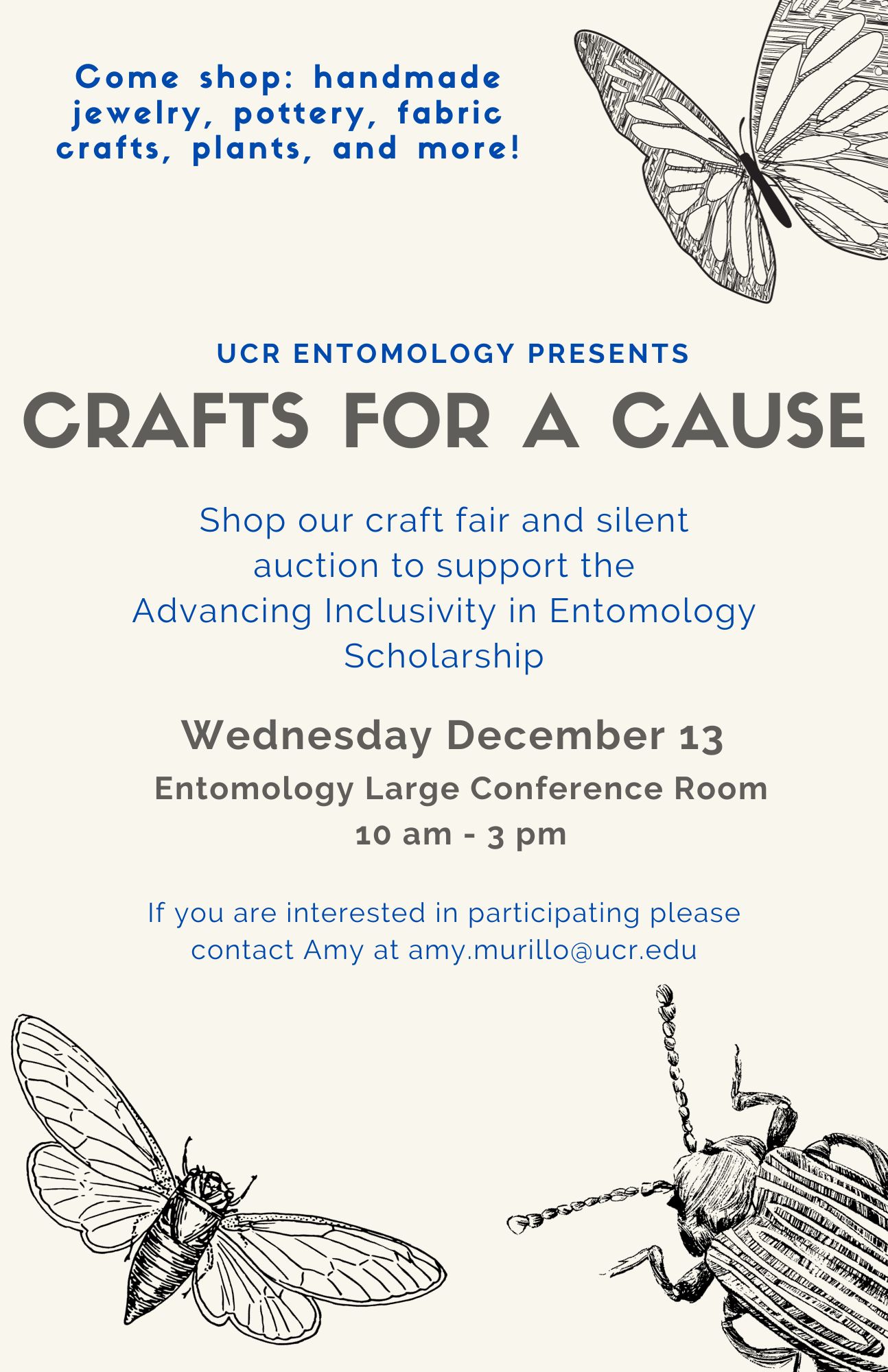 Please join us for on Wednesday December 13 in the Entomology large conference room for a fundraiser to support the Advancing Inclusivity in Entomology Scholarship. We will have a variety of homemade and home grown items for sale (cash, Venmo, or PayPal accepted). There will also be a silent auction for some special items! This is a great opportunity to do some holiday shopping...