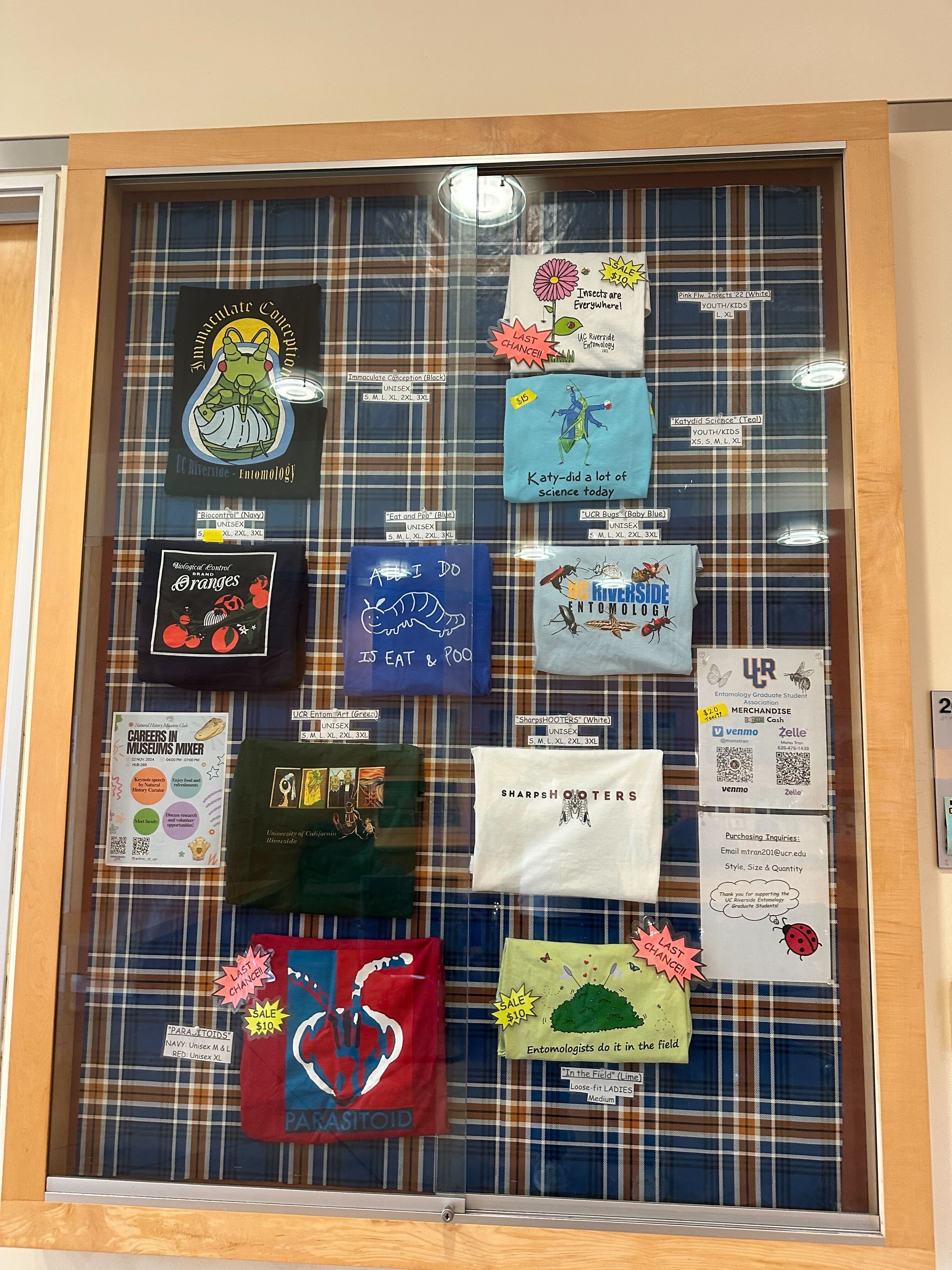 Please check out the updated merchandise display for available styles/sizes and prices on the 2nd floor of Entomology (images below). Share this with any friends or family who may be interested.