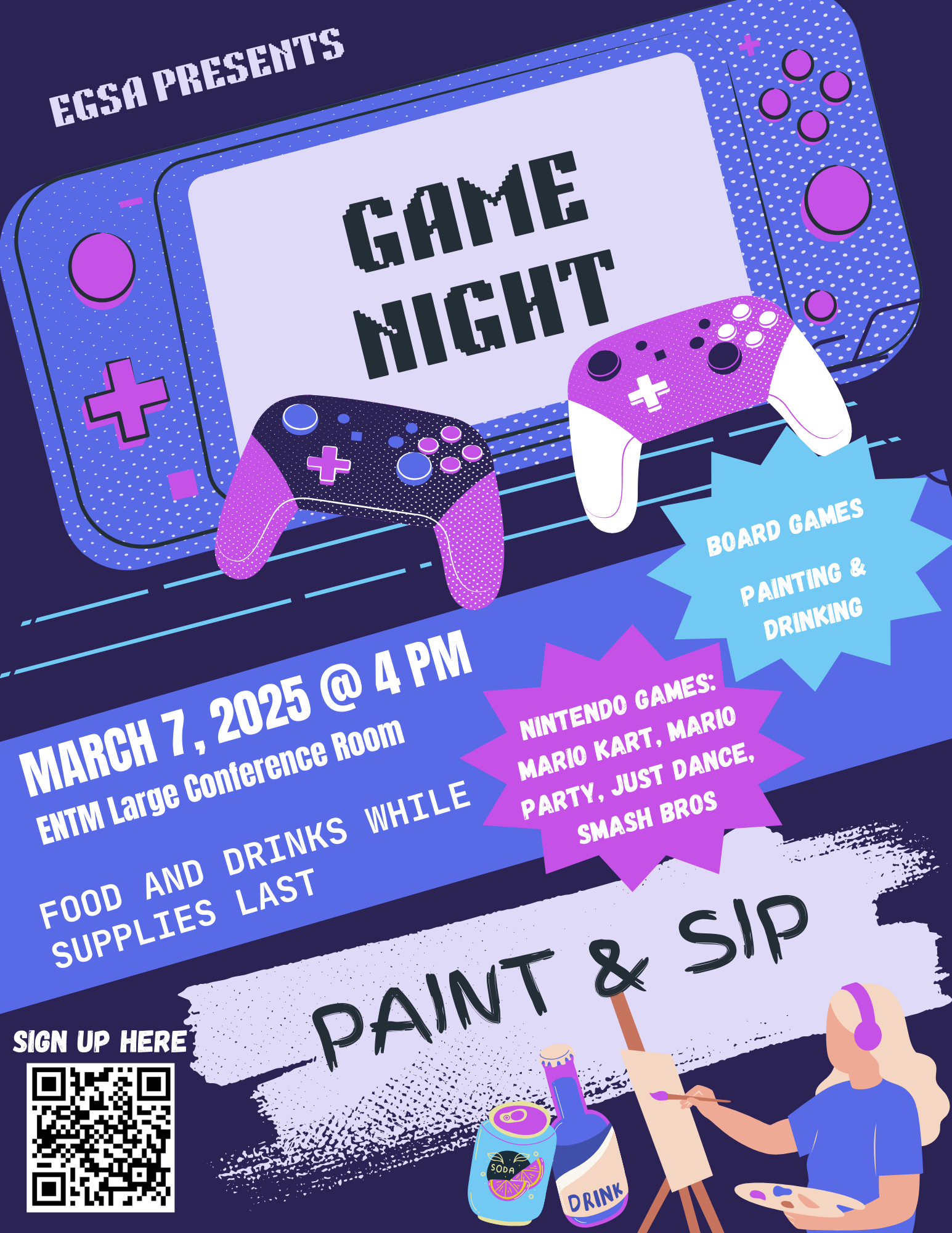 Prepare for an epic *Paint & Sip Game Night* by EGSA on *Friday, March 7*