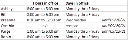 We have a few schedules with temporary remote work arrangements through mid-September. For those individuals, please continue to reach out through email, Zoom or cell phone, using the method that has worked amongst us since March of 2020.