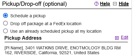 The FedEx outgoing package wire basket is also available for use at the Admin Office. A scheduled pickup at Entomology Building 162 must be made at the time of creating the shipment label otherwise FedEx personnel will not know to come looking for it.