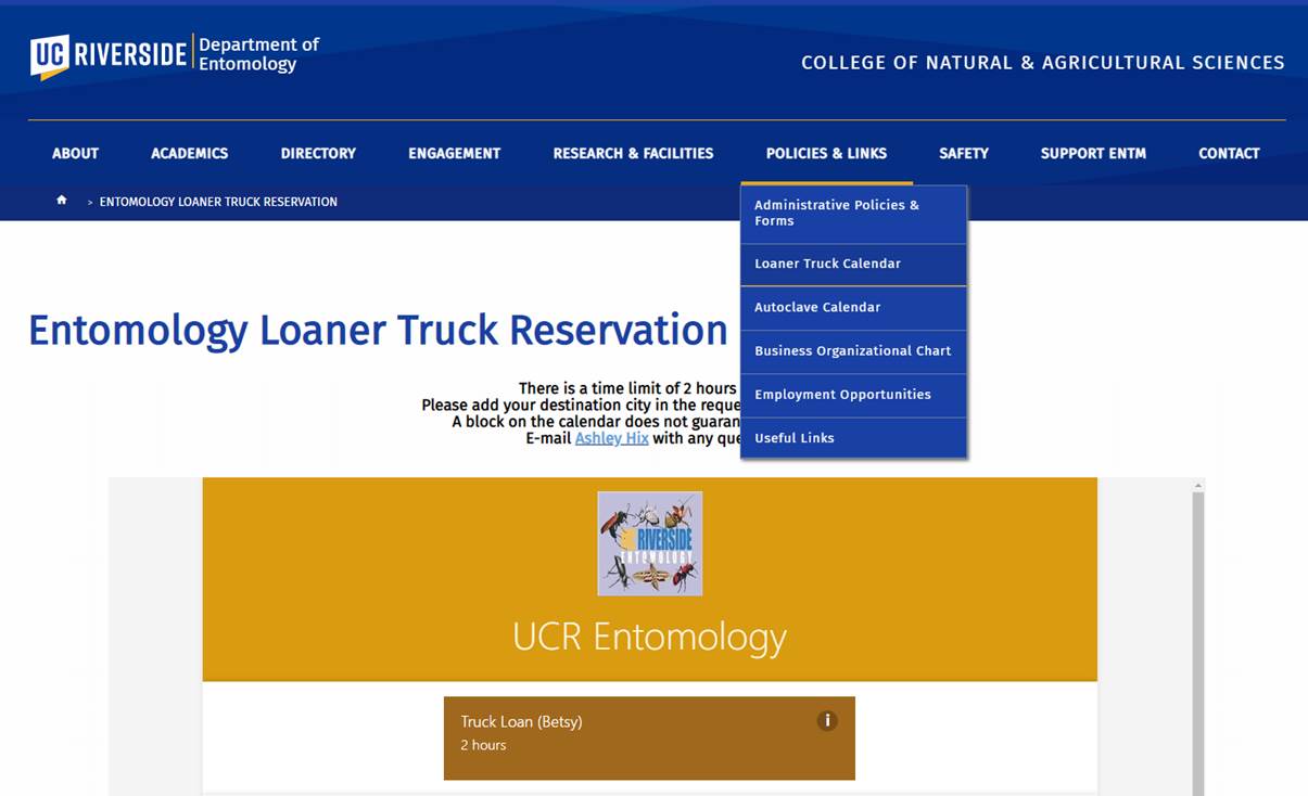 The department has recently gotten an older-model pickup truck that can be requested for use. The link to request the loaner truck can be found under the "policies and links" tab on the main Entomology website. The booking calendar can also be accessed directly at: https://outlook.office365.com/owa/calendar/UCREntomology@o365ucr.onmicrosoft.com/bookings/.