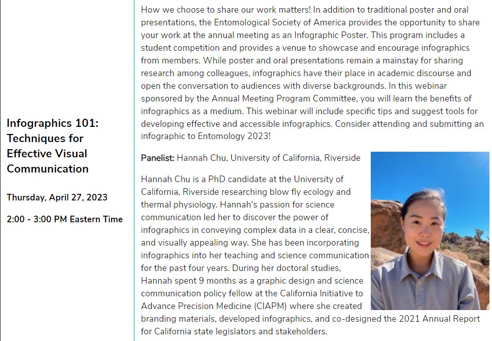 I would like to make you aware of an ESA Webinar taking place later this month. Hannah Chu will be presenting Infographics 101: Techniques for Effective Visual Communication on Thursday, April 27, 2023 2:00 - 3:00 PM Eastern Time. This webinar is free to ESA members. You can register here<https://www.entsoc.org/events/webinars/upcoming>.