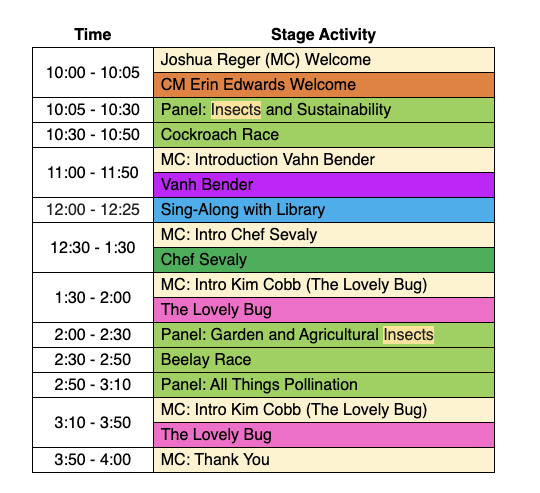 The Riverside Insect Fair is this Saturday! In case you are planning out your day, attached is a rough schedule of the day's events. The only slight change is that the Garden and Ag Insects panel will be 20 minutes and the remaining 10 minutes will be a waggle dance demo.