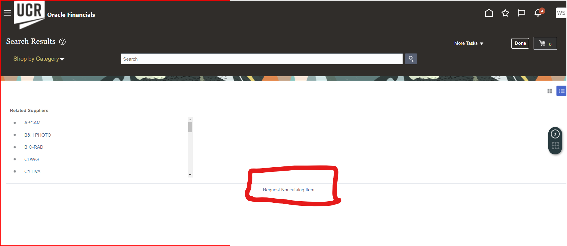 If you are working on an order and have clicked into the Punchout Catalog Smart form and you see "Request Noncatalog Item" DON"T USE IT !!!! This should have been removed or at least turned off since it will just create an error and your order will not work. It is in the red circle below.
