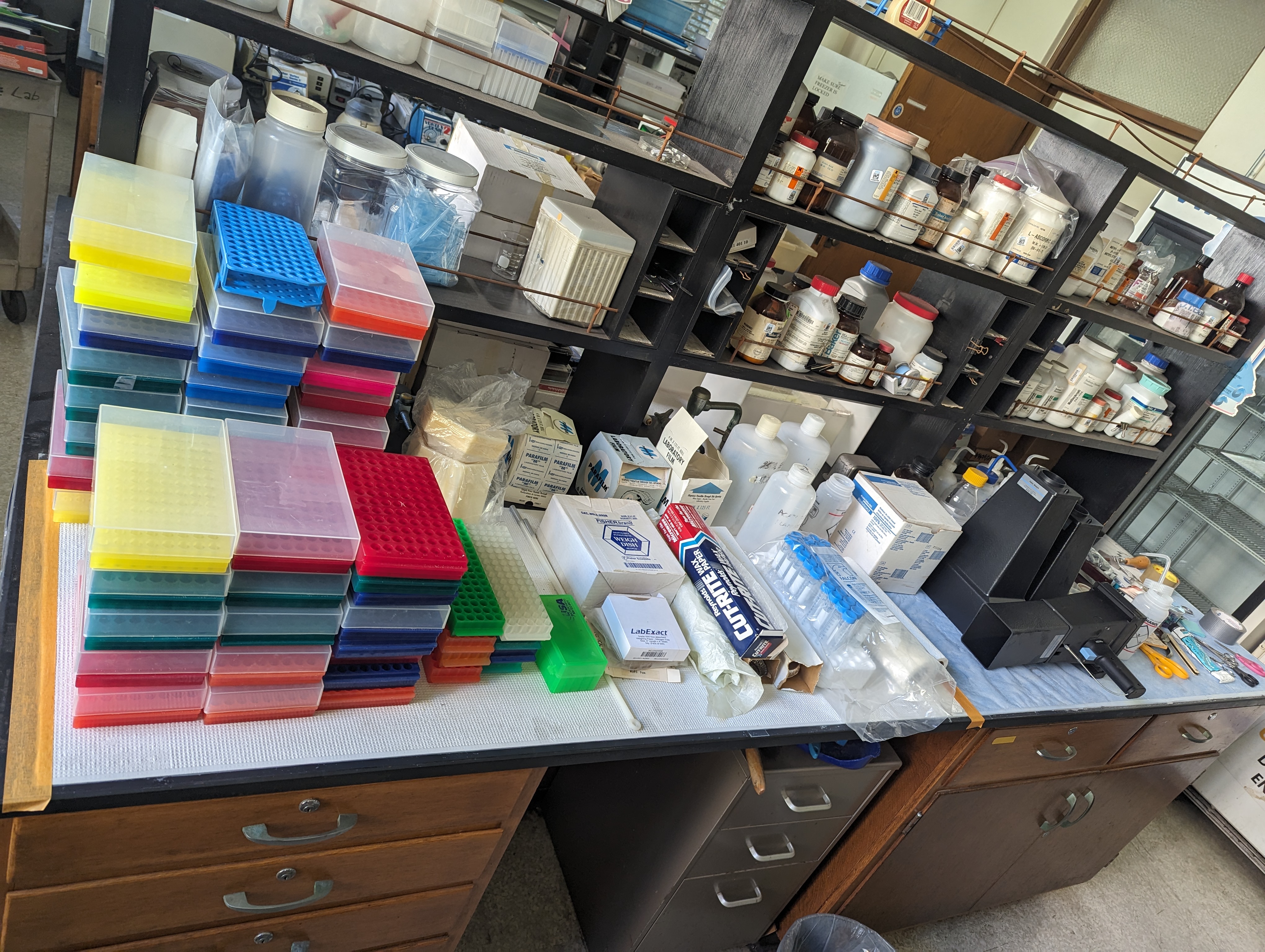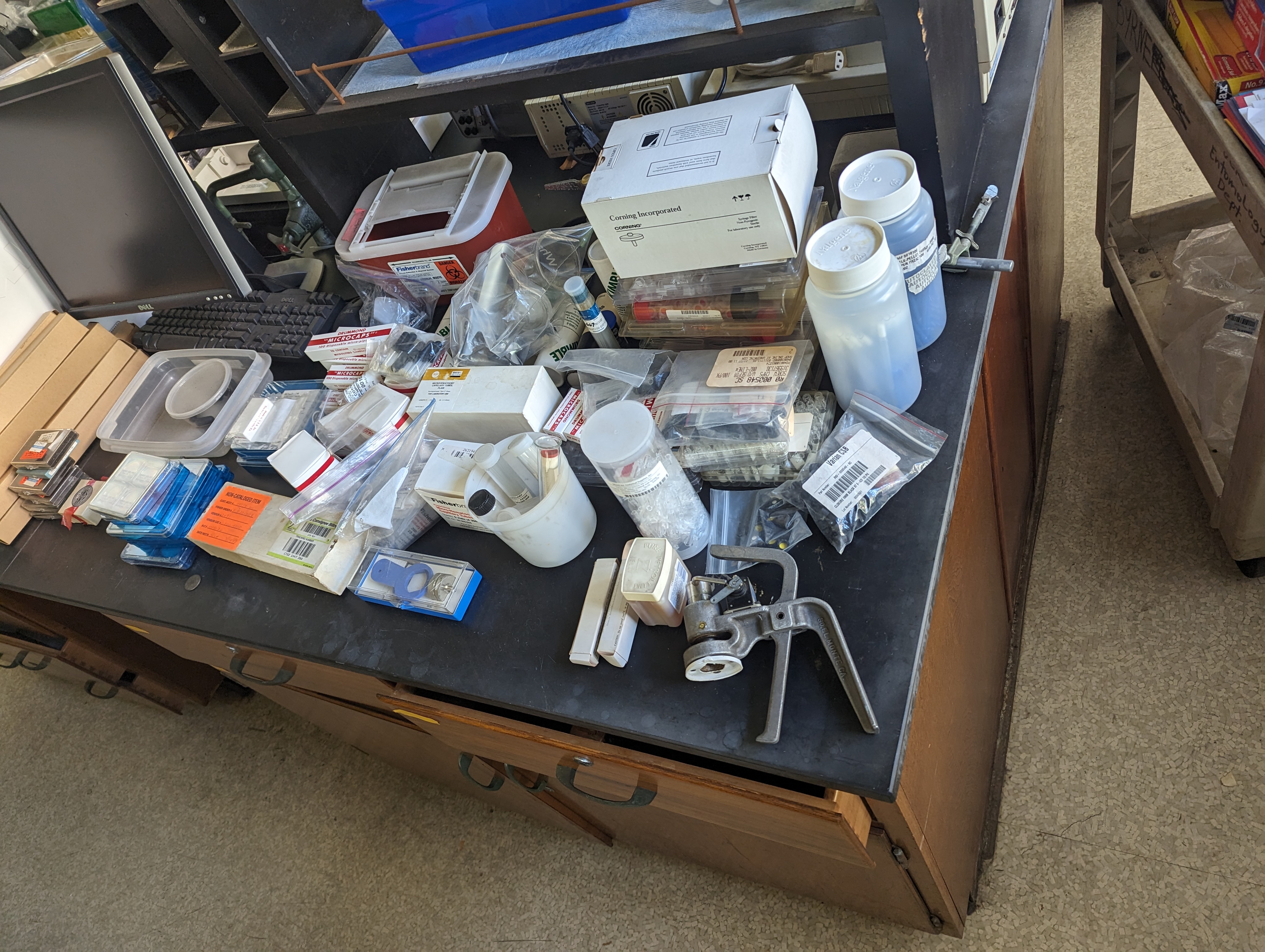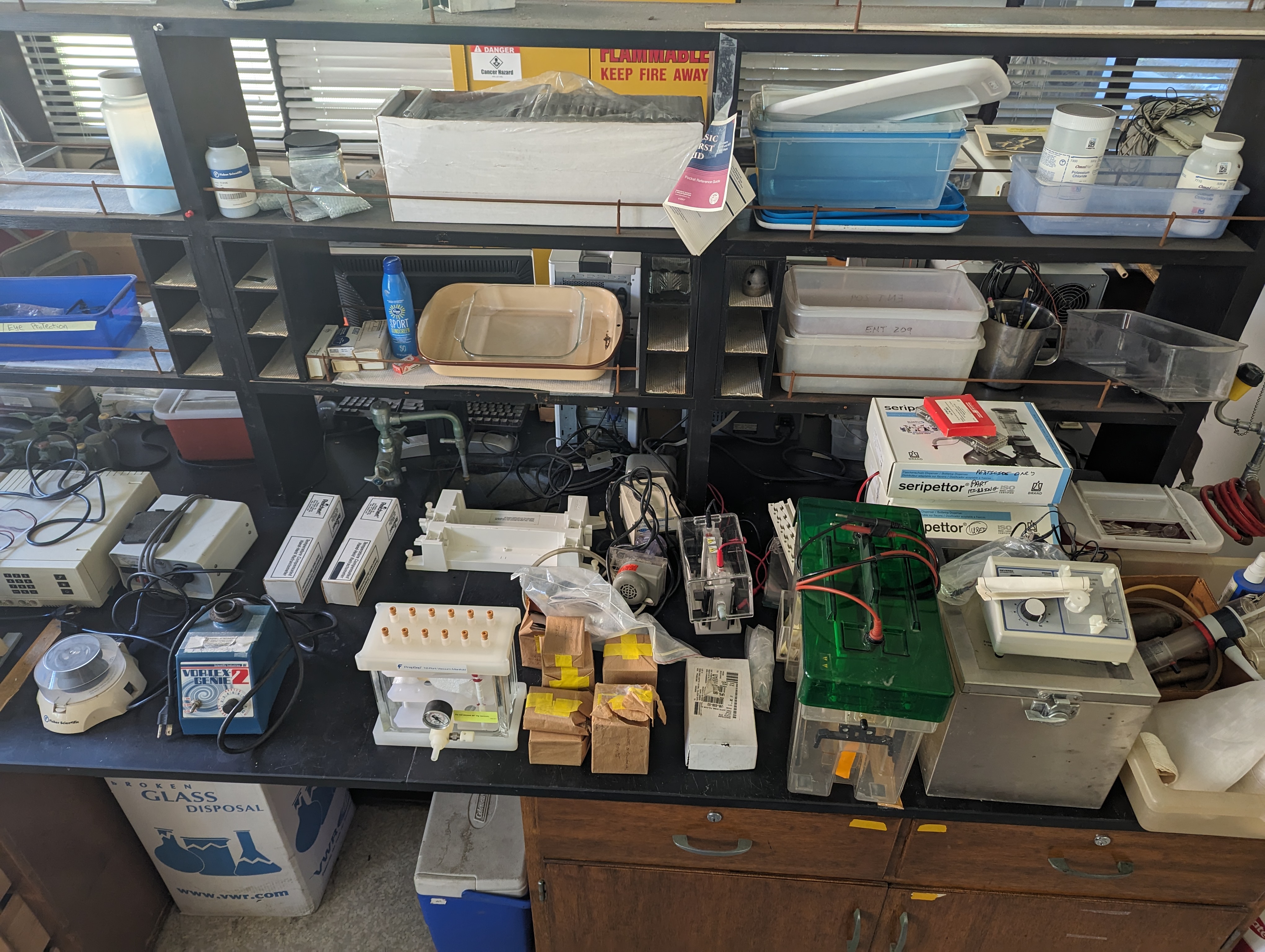 Anything on the "island" bench tops or the bench under the window facing the entomology building. Some equipment, and various vials pipettes, pipet tips etc. If it doesn't find a home, it will be disposed of. Here's a few pictures to give you an idea of what is available. Take what you want, leave the rest in a tidy state for others. Don't take chemicals! They have been inventoried and will be available shortly.