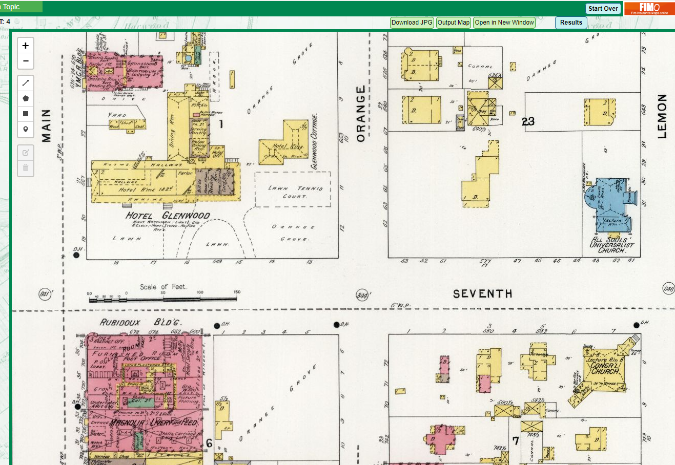 To give you an idea of what's available, here's a sample of a Sanborn map of downtown Riverside from 1895: