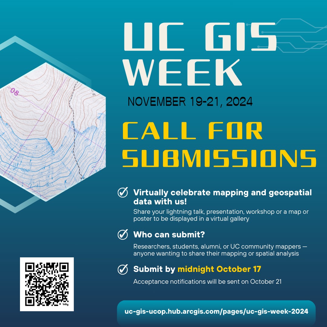 Share your accomplishments and inspire others through your mapping and spatial analysis at the 5th annual UC GIS Week event, being held November 19th - 21st, 2024.