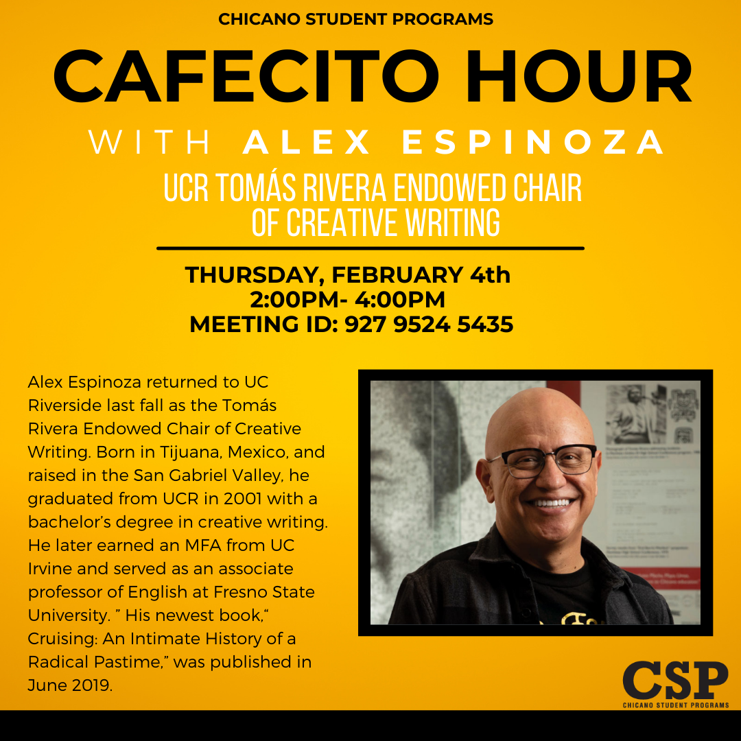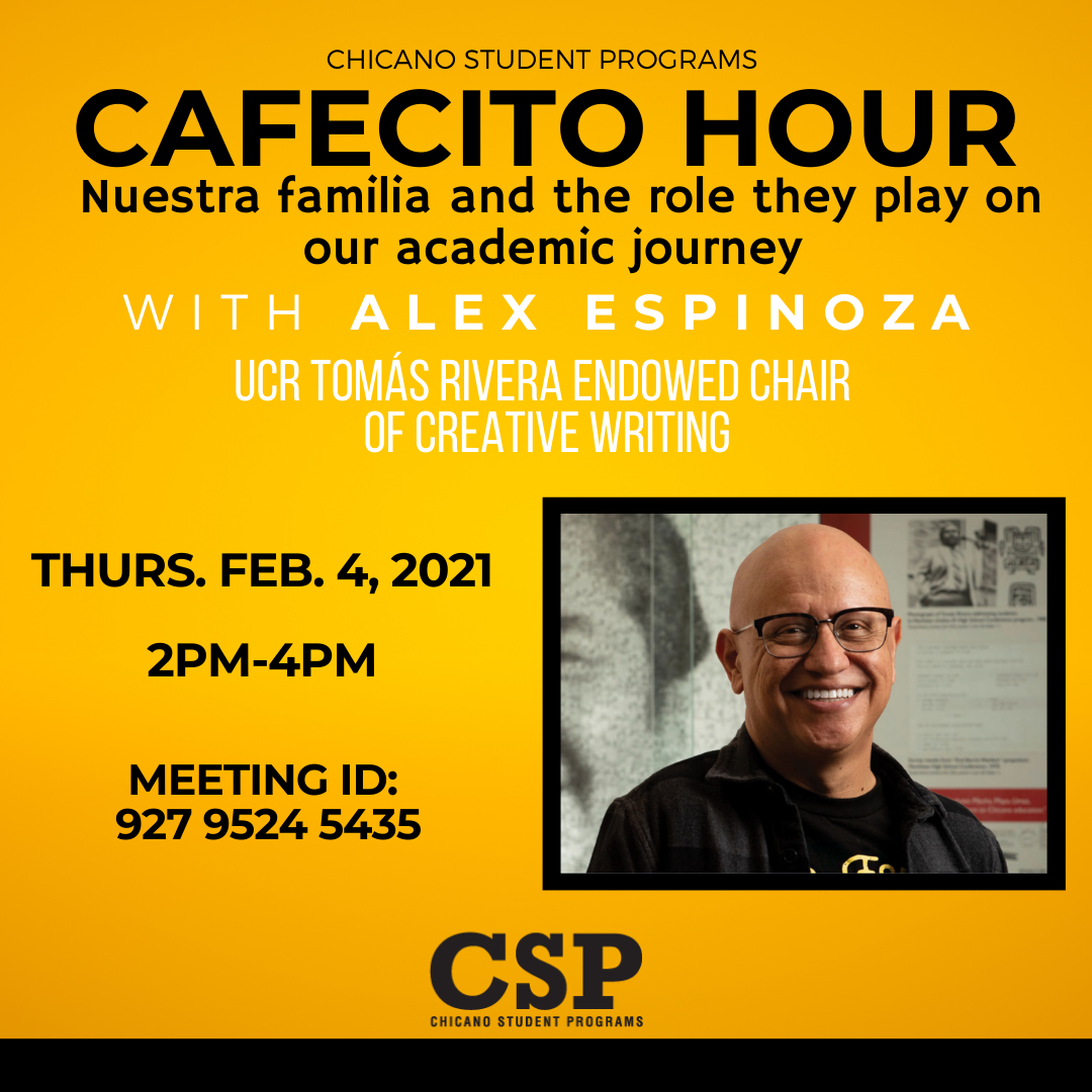 Theme: Nuestra familia and the role they play on our academic journey with Tomás Rivera Endowed Chair of Creative Writing Alex Espinoza. Cafecito Hour, is a quarterly series hosted once a month, open to graduate students only. This is an opportunity to network with other Chicano/Latino graduate students as well as discuss relevant topics in our communities with the intent of supporting, empowering and retaining grad students of color.