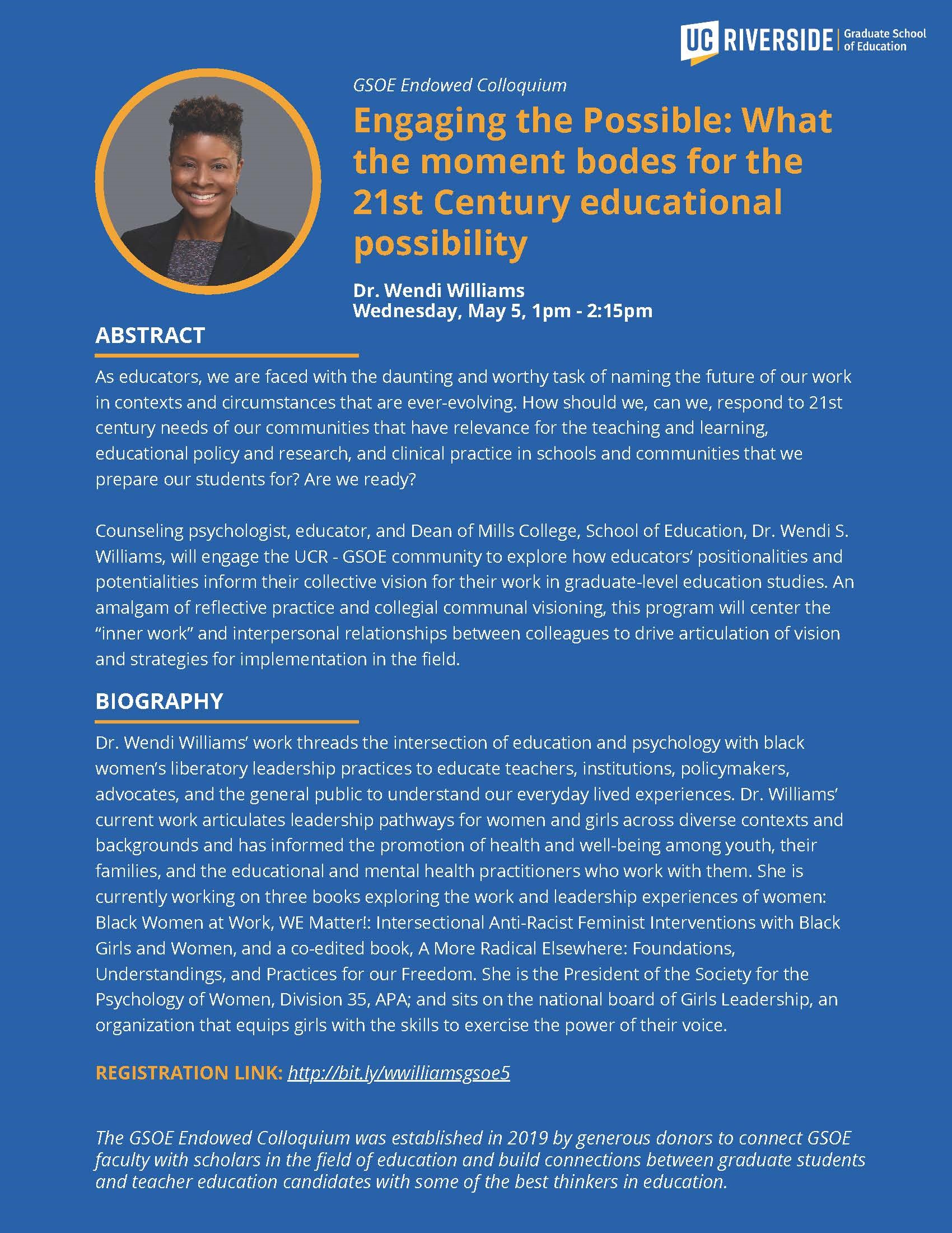 [Gradstudents] REMINDER: 5/5 @ 1PM: GSOE Endowed Colloquium w/Dr. Wendi Williams