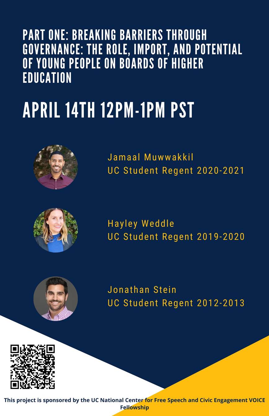Join us as we bring together UC Board of Regent Student Trustee Emeriti to discuss the importance of civic engagement and young leadership at the University of California. These conversations aim to educate students about the intentional ways in which students participate in, lead, and change higher education. We invite student trustees to present in seminars open to the UC student population and discuss their experiences, challenges, and growth as student leaders. There is a great deal to learn from these students who have spent their tenure on the board constructing what it means to be a leader, what it means to be civically engaged, and what it means to make a difference.