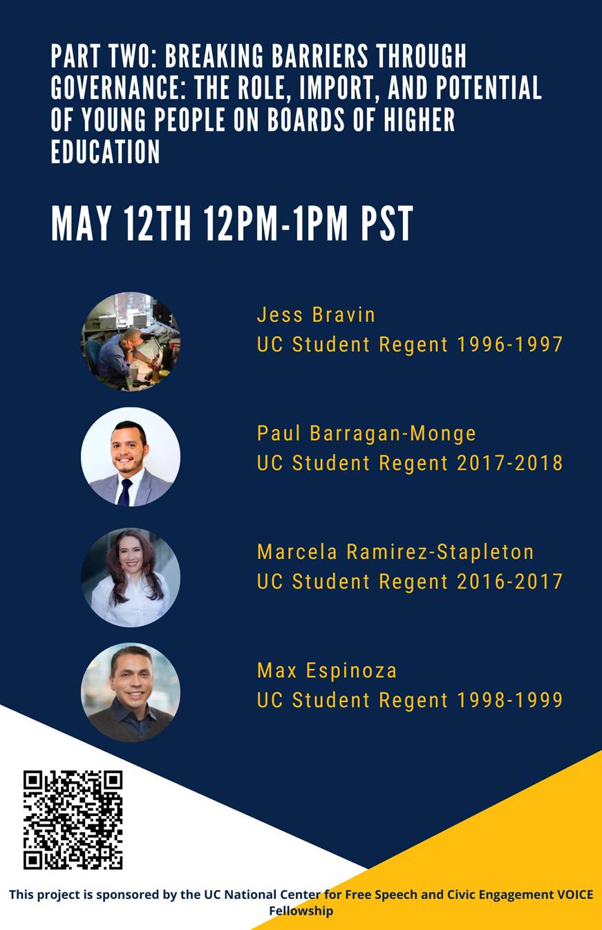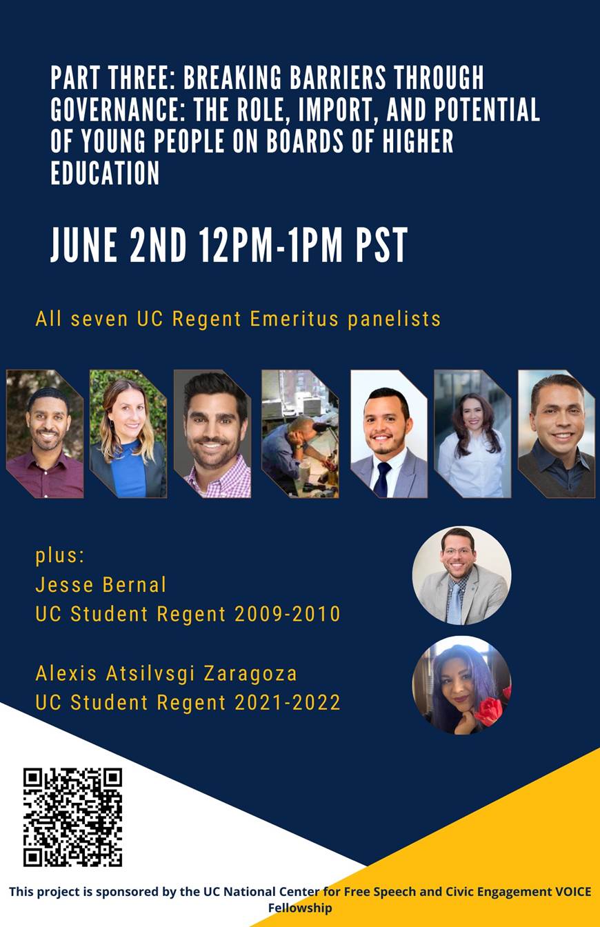 Our conversation on June 2nd will invite panelists to work together with audience members to address the most critical UC issues in today's environment. We hope the audience will learn that the role of Student Regent is often met with conflicting needs of their constituents, issues that require extensive collaboration with state and local leadership, and issues that require both short and long-term problem-solving.