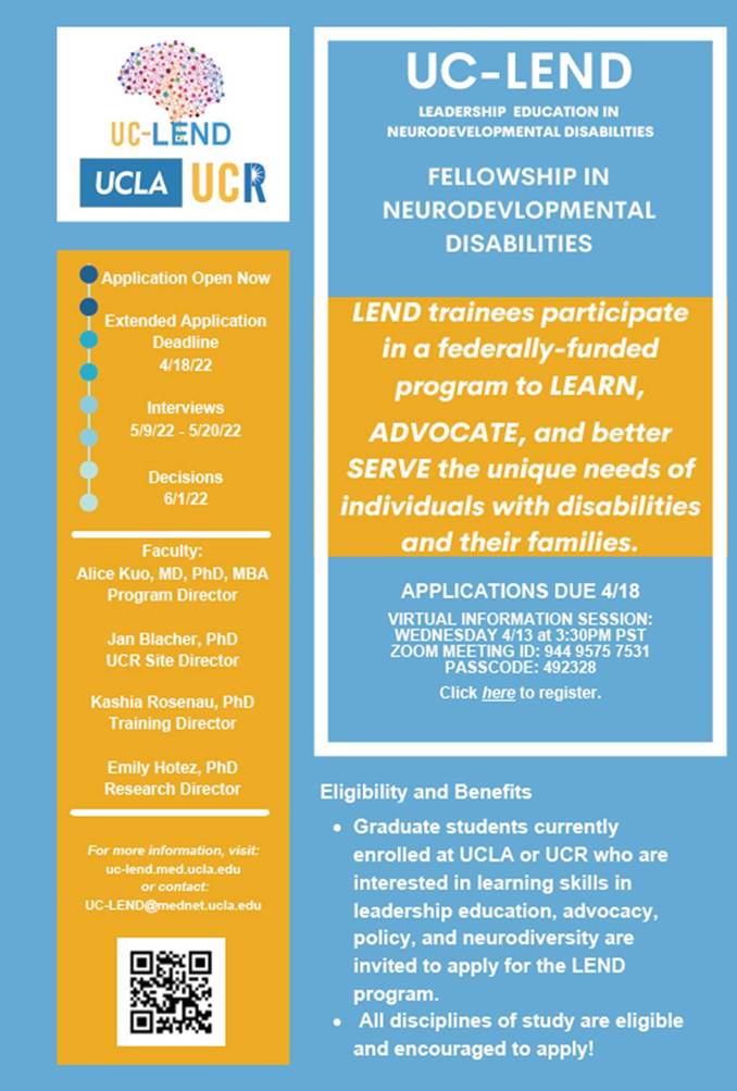 I hope you are well! I am reaching out to remind you that the University of California Leadership Education in Neurodevelopmental Disabilities (UC-LEND) training program is currently accepting applications for trainees in the 2022-2023 cohort. The application deadline is quickly approaching, so please circulate the following information to your graduate student network. Applications must be submitted by Monday, April 18, 2022.