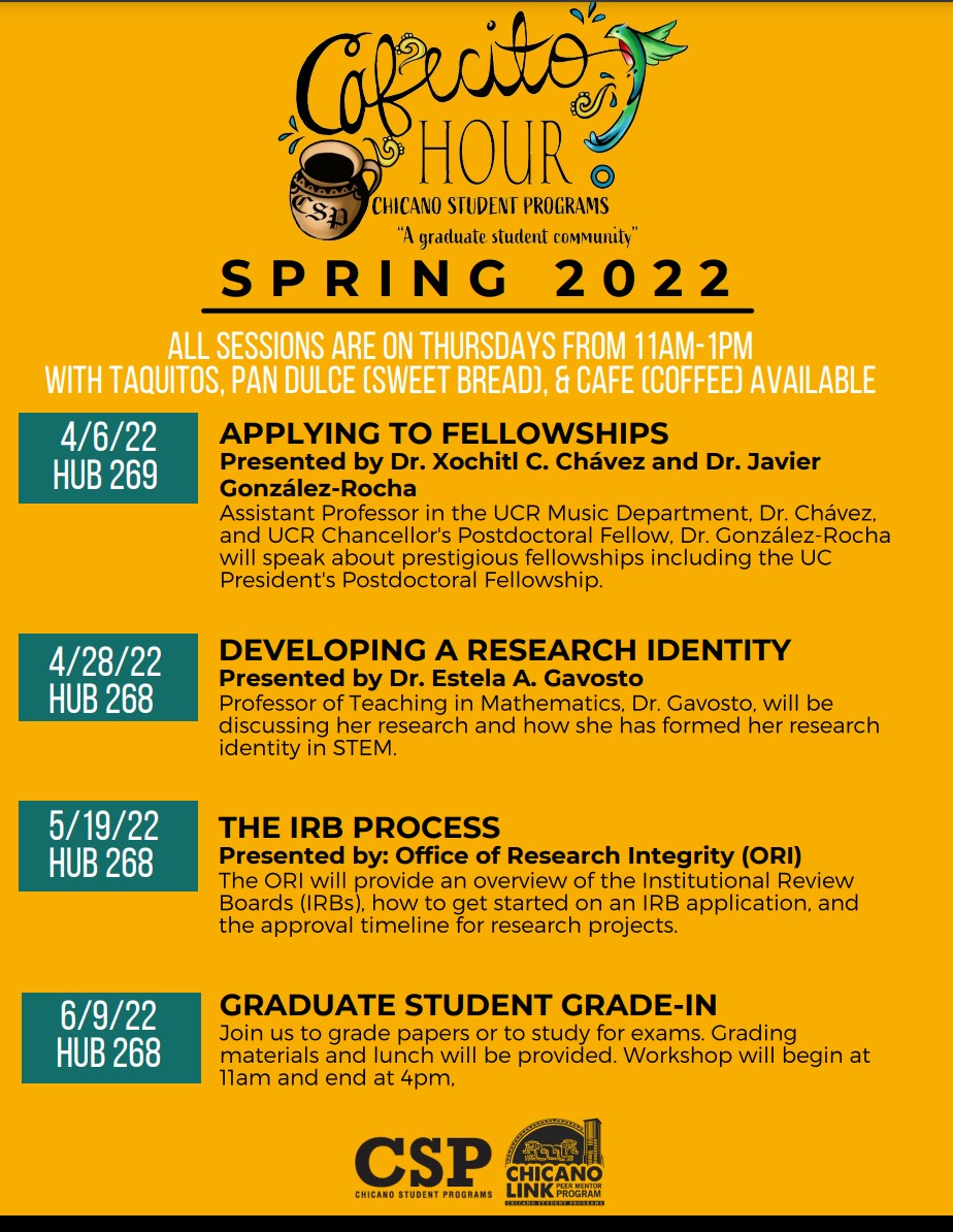 Chicano Student Programs is hosting an upcoming Cafecito Hour event on Thursday, April 28th 11 am to 1 pm: Developing Your Research Identity by Dr. Estela A. Gavosto. The event will be in HUB 268.