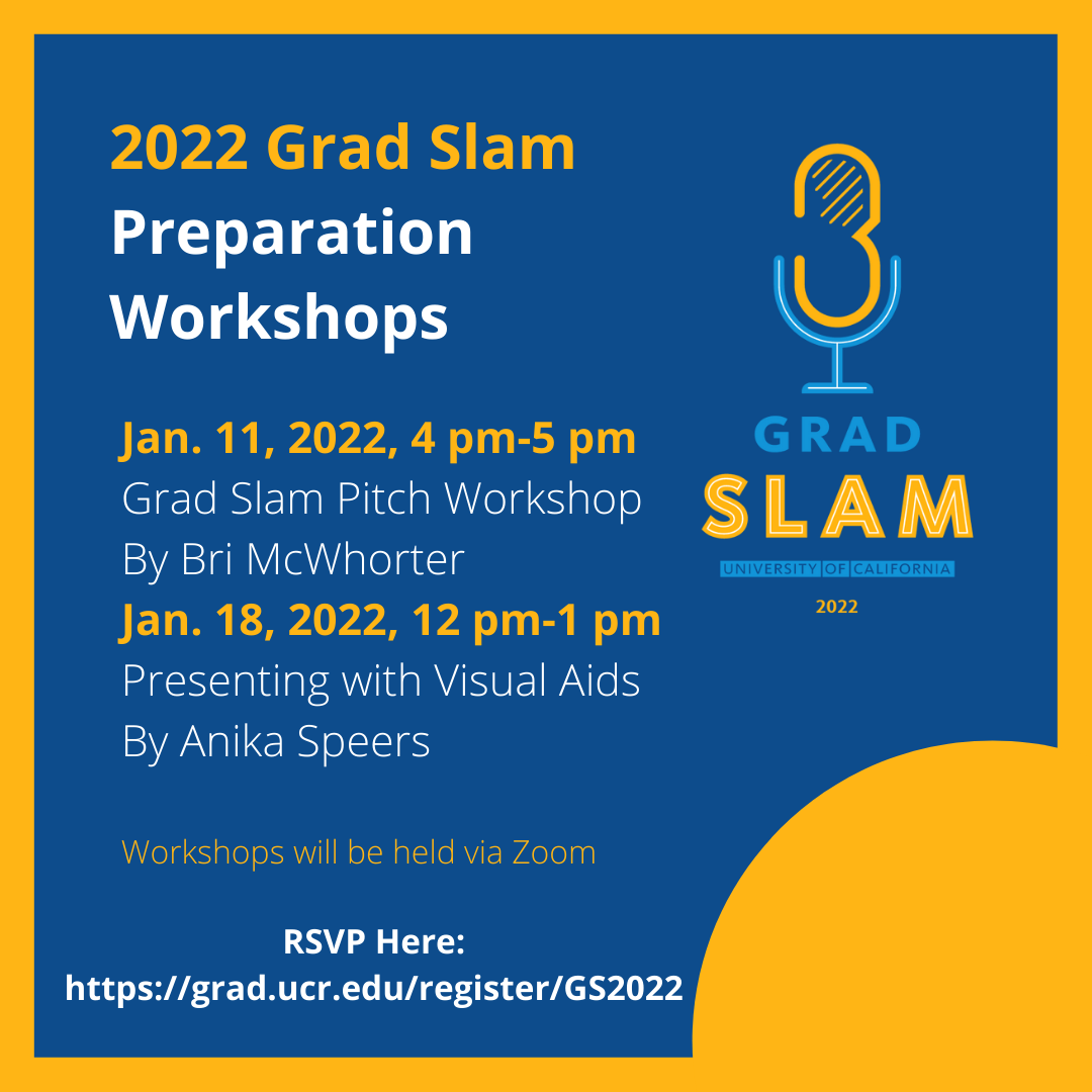 * It's time for Grad Slam 2022! First round video submissions are due January 24th, and preparation workshops will be offered online on January 11th and 18th. Learn more at: https://gsrc.ucr.edu/grad-slam-2022.