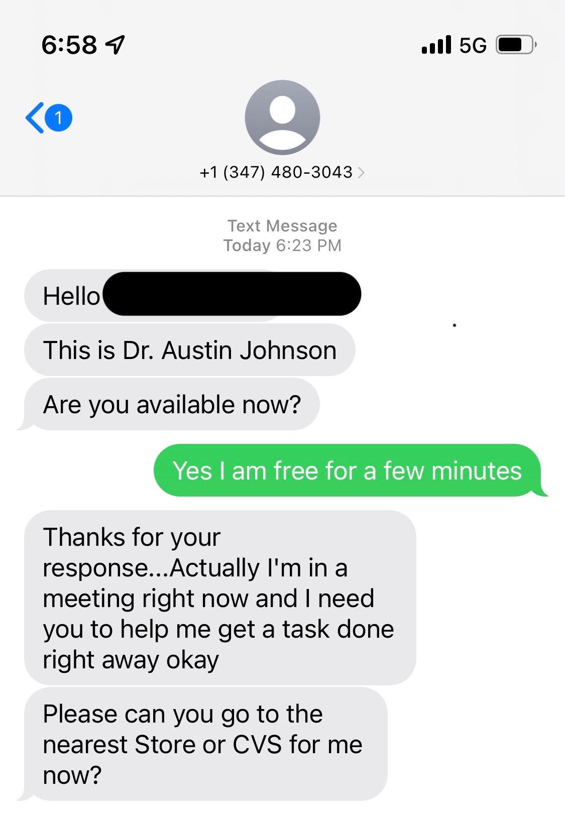 A scam seems to be taking place this evening involving students' personal cell phones and phony texts. At least two students have received messages stating that the person is a faculty member, and that they would like the student to go to CVS or a store for them. An example of such a message (with the number that the texts have been originating from) is pasted below. Please be extremely cautious; these are not legitimate messages from faculty.