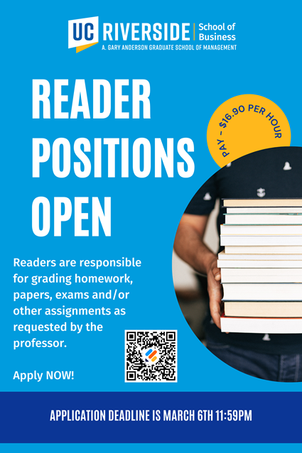 The School of Business is hiring readers for Spring 2022. If you're interested, see flyer for application details.