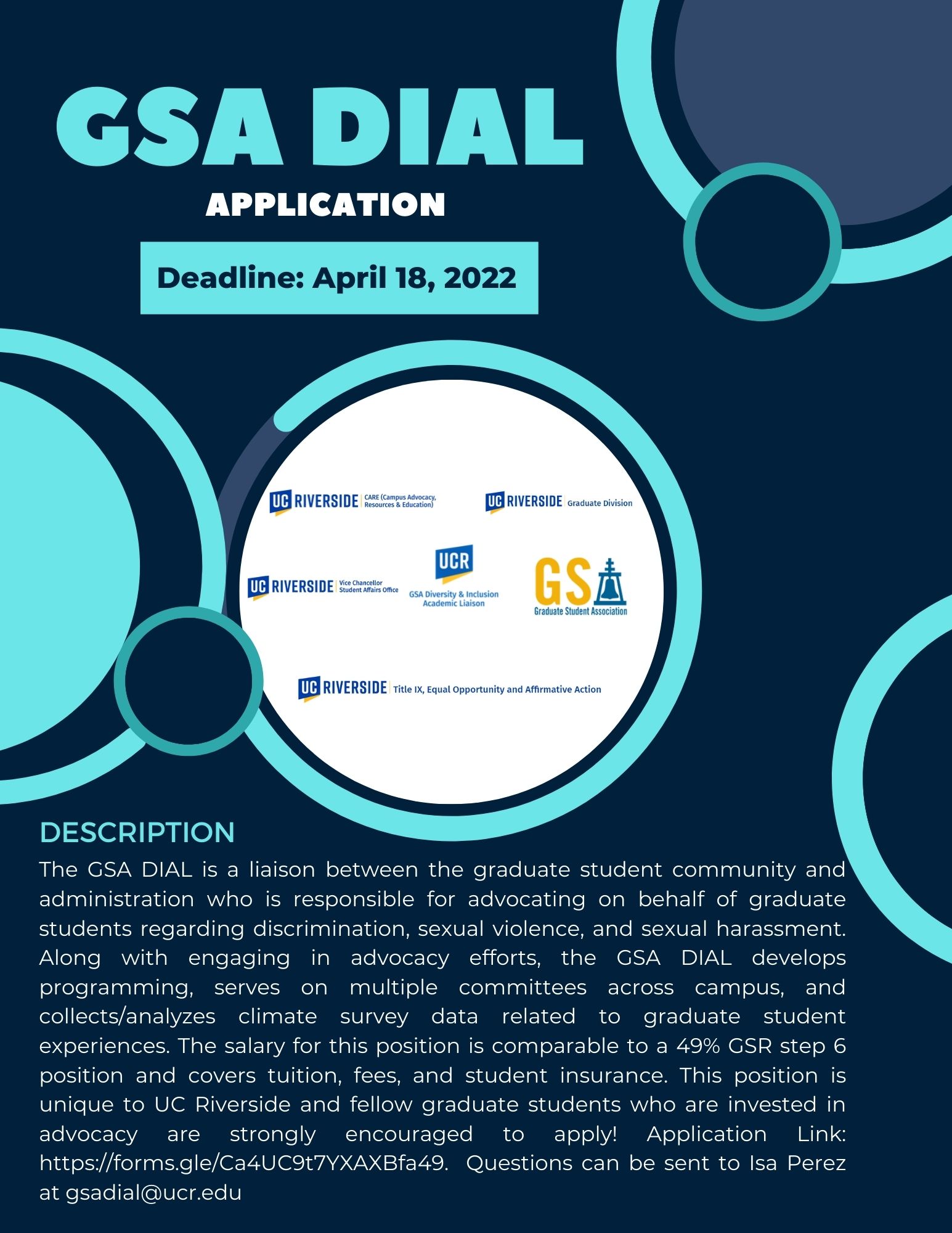 * Applications<https://forms.gle/Ca4UC9t7YXAXBfa49> are open for the GSA Diversity and Inclusion Academic Liaison, a 50% position (equivalent to a GSR Step 6) with possibility of renewal for a second year