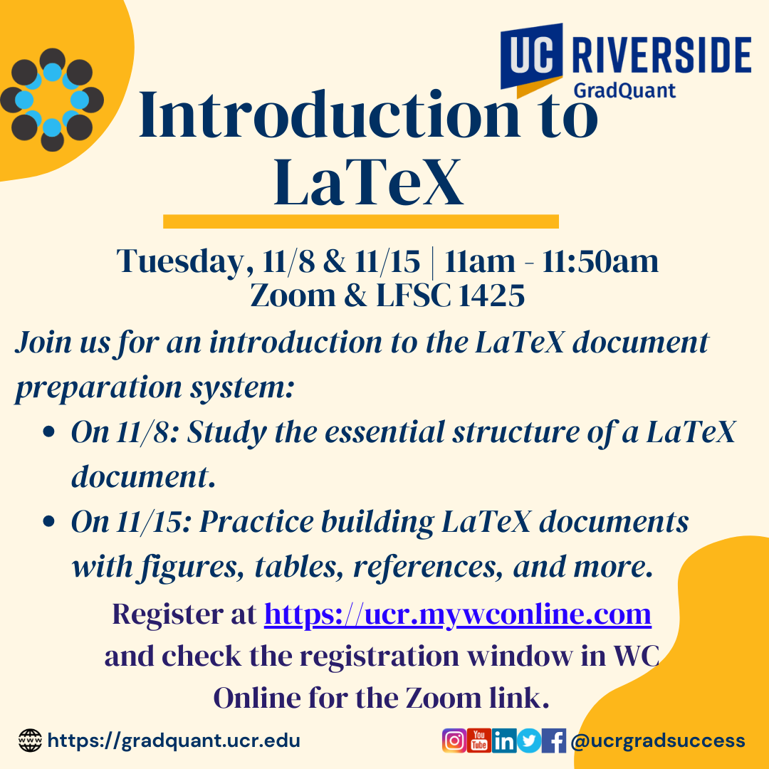 * GradQuant<https://gradquant.ucr.edu/programs/workshops/fall-2022> has several upcoming workshops on "Intro to LaTeX," "Intro to Machine Learning," and "Intro to MATLAB" you may want to check out. Also, remember that we record our workshops and recordings are available to view online!