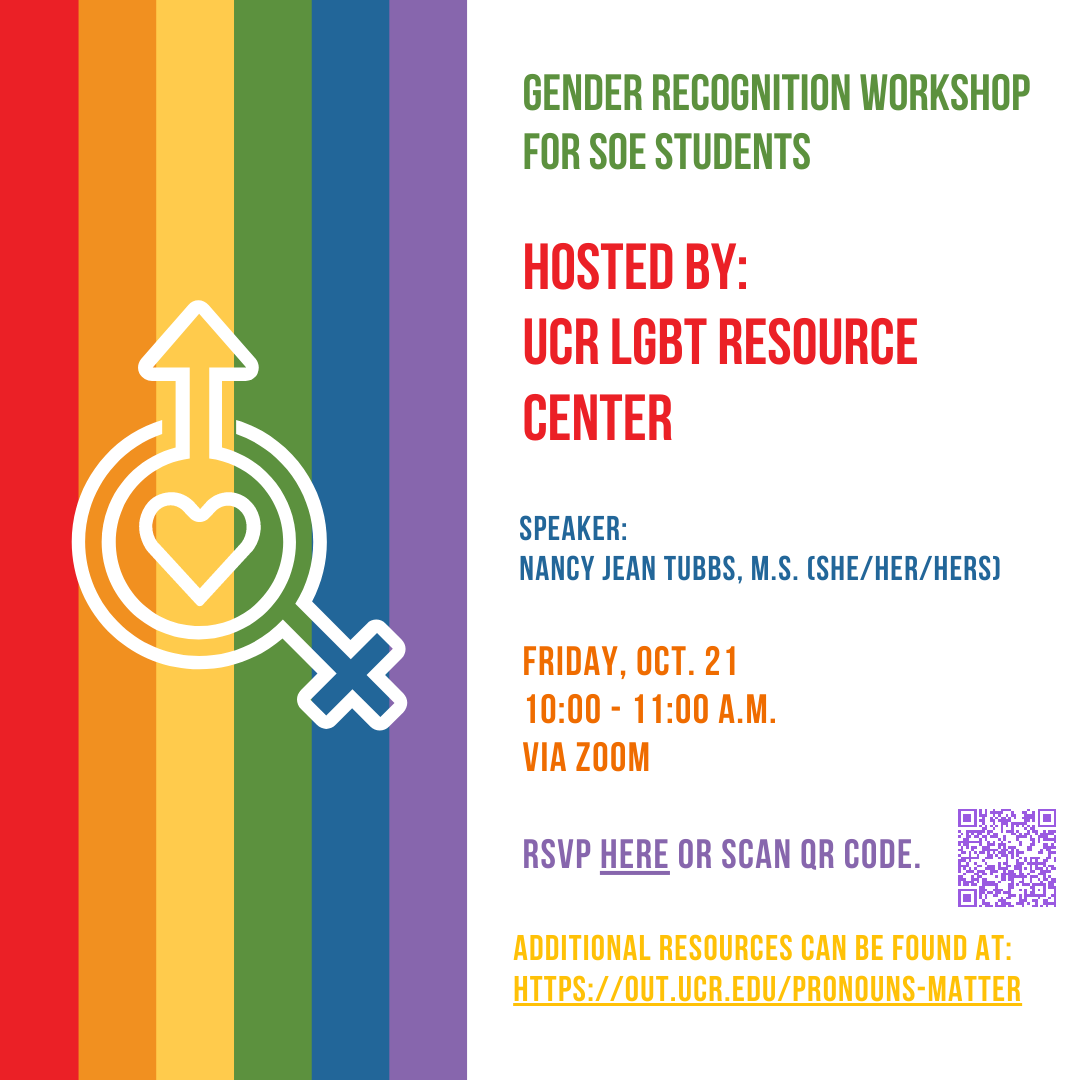 LGBT Resource Center Director, Nancy Jean Tubbs, will be hosting a Gender Recognition workshop for SOE students. This professional development opportunity will be held on Zoom Friday, October 21st from 10-11am. RSVP here<https://ucr.zoom.us/meeting/register/tJMqdO2tpz0oG9zszorJIknF5Xz-ftz4mVSy>. Prior to attending the workshop, you can find additional resources here<https://out.ucr.edu/pronouns-matter>.