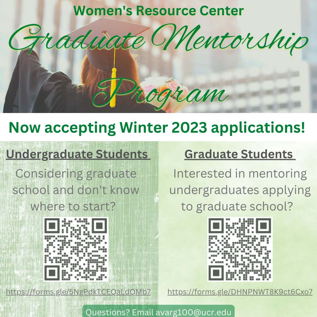 The Women's Resource Center's Graduate Mentorship Program is now accepting applications for the Winter 2023 quarter! For 10 weeks, UCR undergraduate mentees will meet once a week with UCR graduate mentors to discuss graduate school opportunities and the application process. For undergraduates this is a great way to ask any questions you may have about graduate school and take advantage of one-on-one personalized guidance from a current graduate student who has recently gone through the application process themselves. For graduate students, beyond a CV point, this program offers a great opportunity to engage with the UCR community and gain relevant mentorship experience that is not only helpful during job applications, but also beneficial in every career field. Everyone, not just women, are welcomed as long as they are comfortable in a female-centered space.
