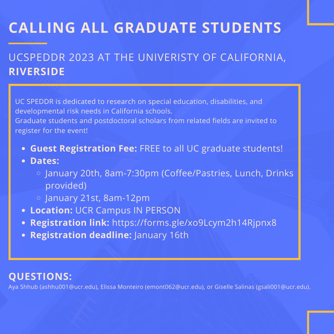 UCR is hosting UC SPEDDR on January 20-21, 2023. UC SPEDDR is dedicated to research on special education, disabilities, and developmental risk needs in California schools. Graduate students and postdoctoral scholars from related fields are invited to register for the event!