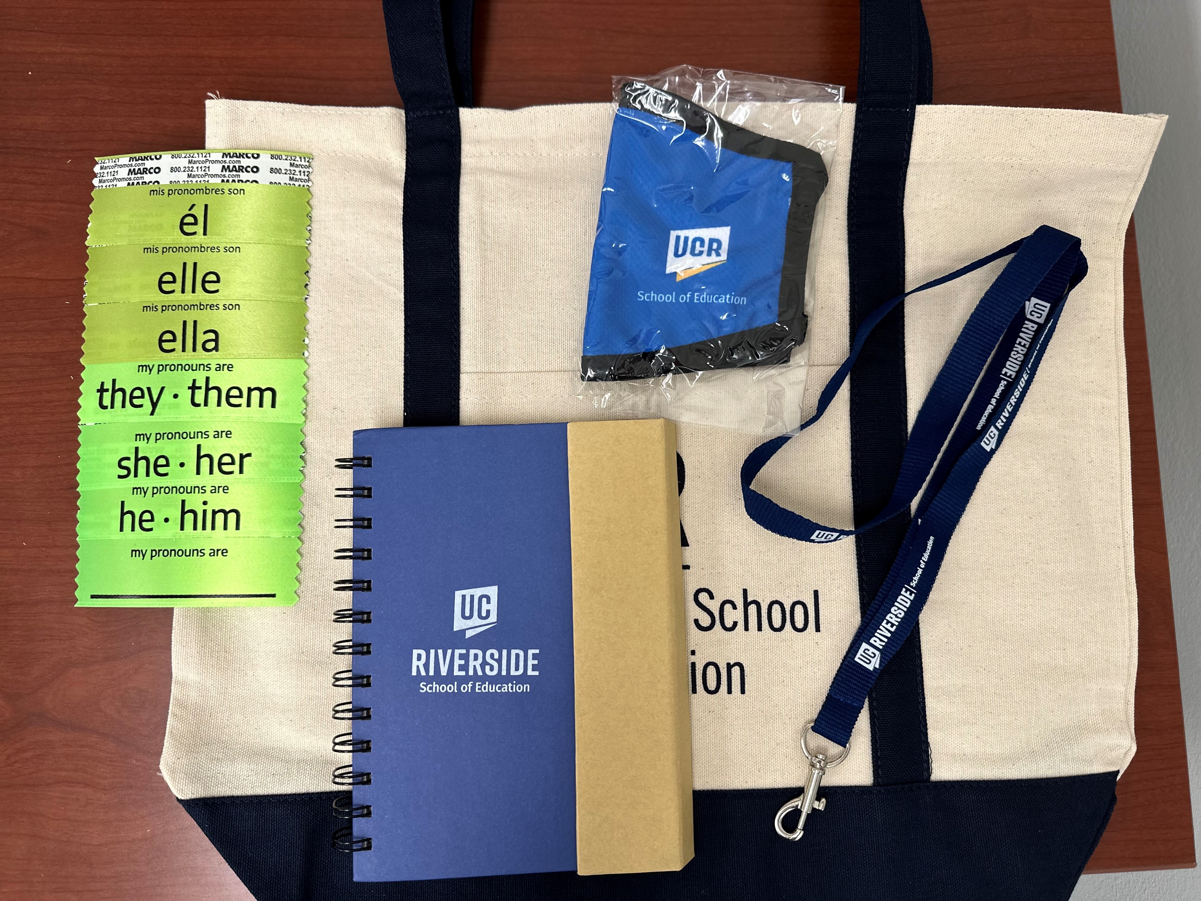 We have a variety of items you can choose from to take with you to the conference. Choose from a SOE lanyard, spiral notebook, tote bag, or mask. We also have pronoun ribbons that you can attach to your name badge (English and Spanish). Pick up your swag and pronoun ribbons in my office (1207 Sproul Hall) Tuesday-Thursday. While supplies last; see attached photo for options.