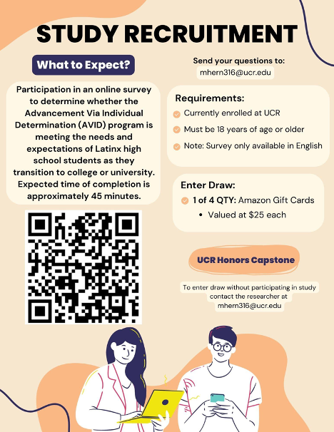 Please consider participating in this capstone research project examining the influence of the AVID program on early college outcomes. You can use the QR code or Qualtrics link below to access more specific information about this study. Thank you in advance for your time and consideration!