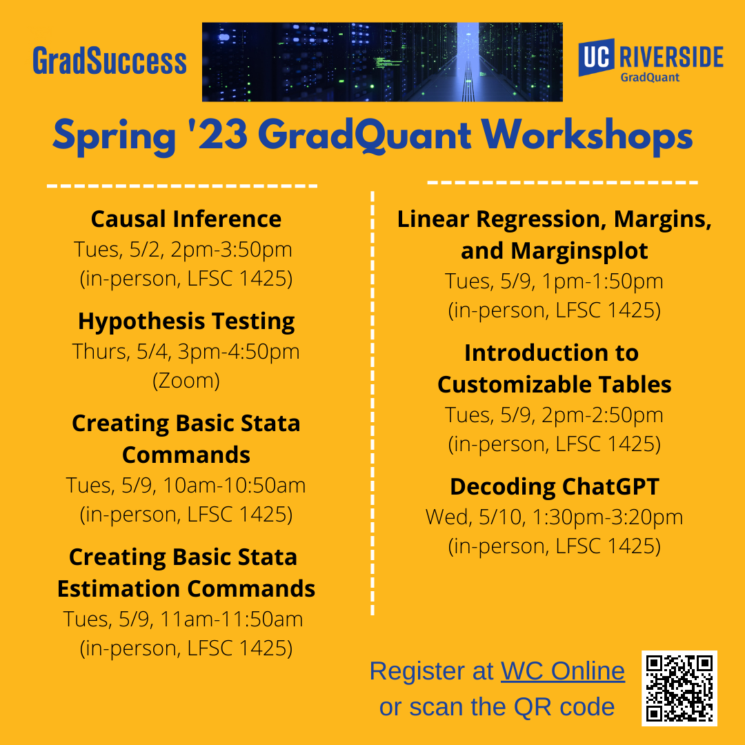 * Grad Quant’s Spring Stata Workshop Series, May 8th-12th (see flyer for a full list of events).