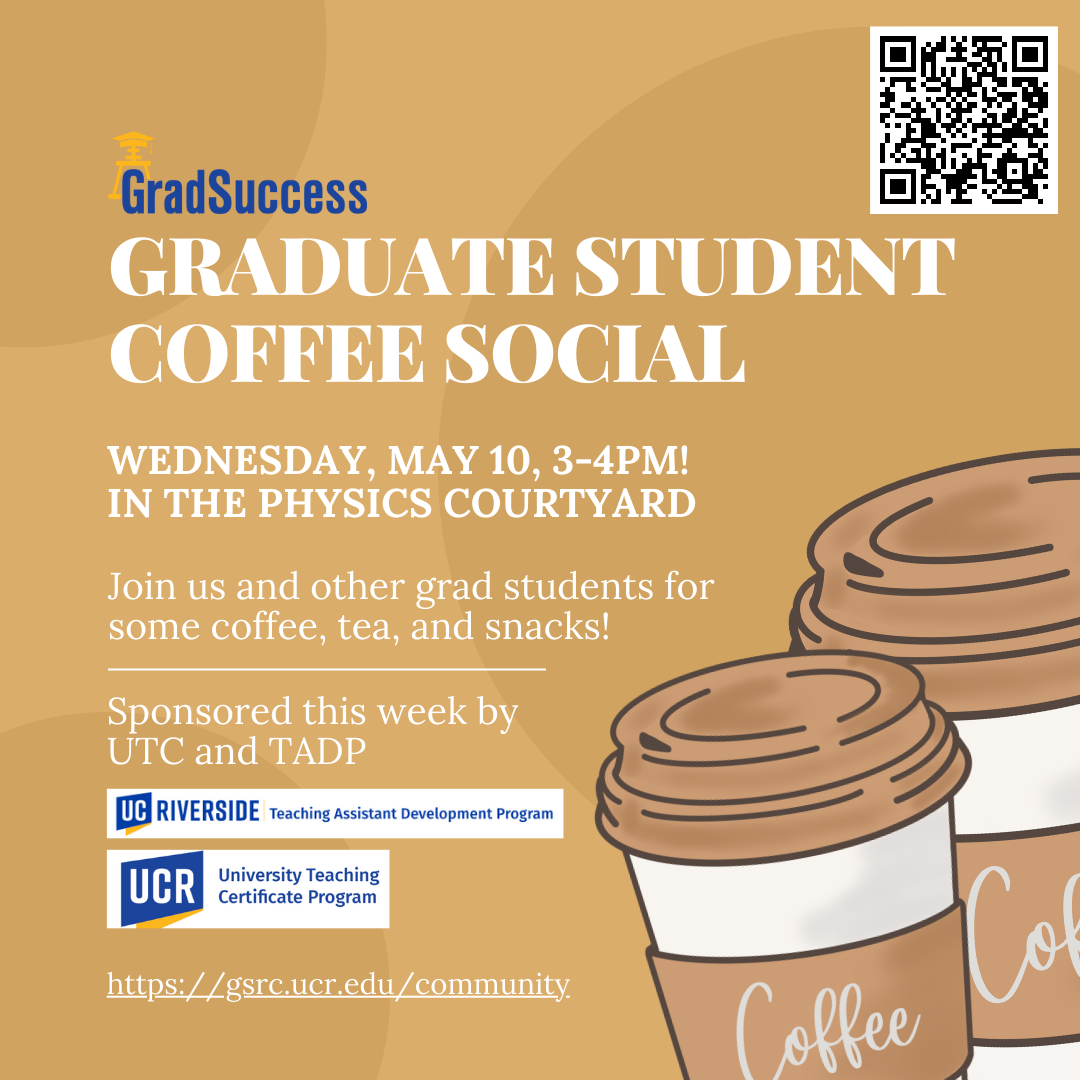 * GradSuccess Coffee Social, Wednesdays, 3-4PM, Physics Courtyard (See GradSuccess IG for updates due to weather)